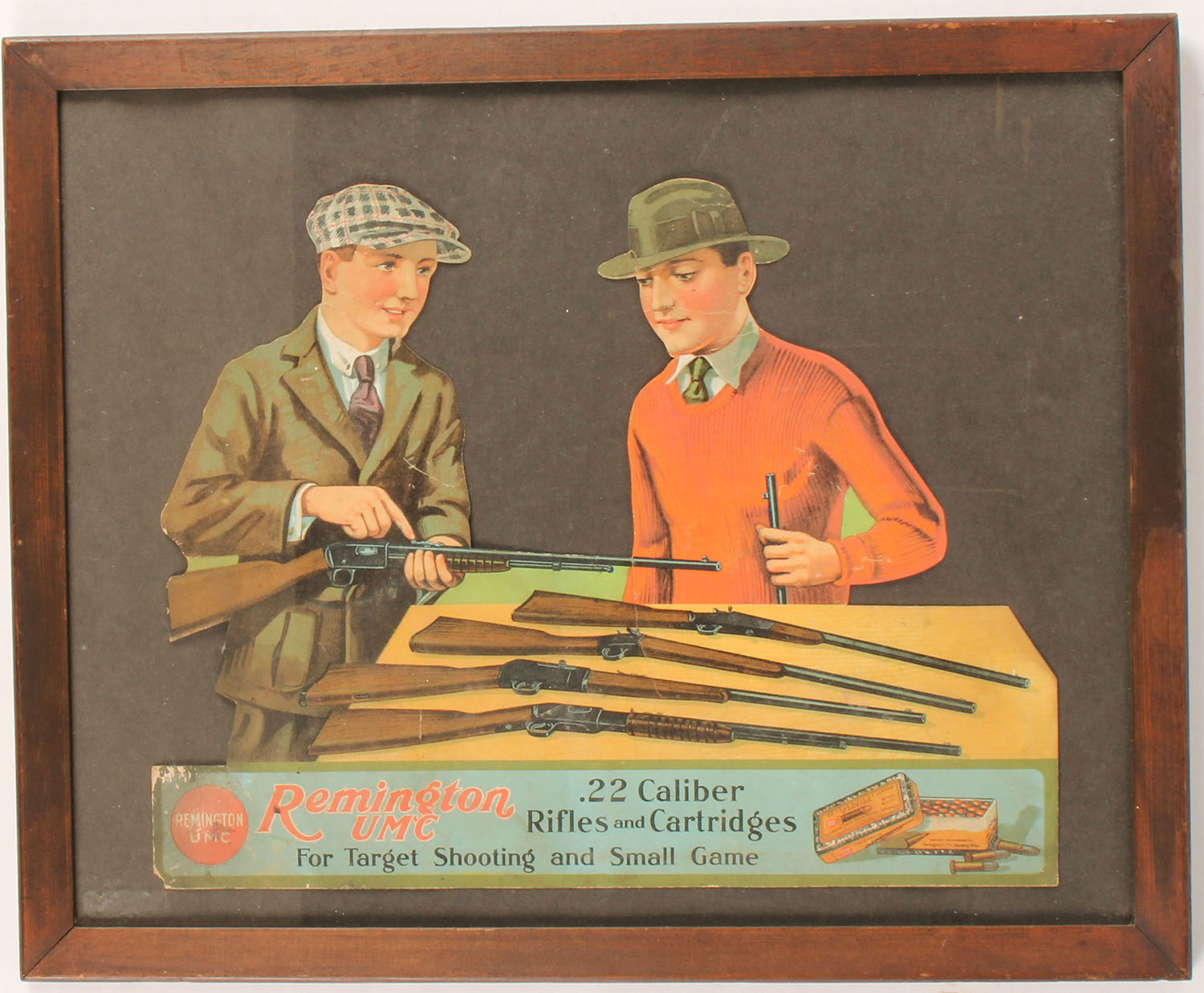 RARE, Rem-UMC 3D Diecut, pictures two young men with Remington's line-up of 22 rifles, Models: 12, 16, 4 & 6, plus a two-piece 22 box. Great colors, some age soiling & staining, creases on both heads/faces, one 3'' tear starting from the top rifles barrel & one small tear on the front brim of the green hat, despite the minor flaws, still a nice example of a rare diecut, 16 1/2'' x 13''. Grade: Very Good - Value: 500 to 1500