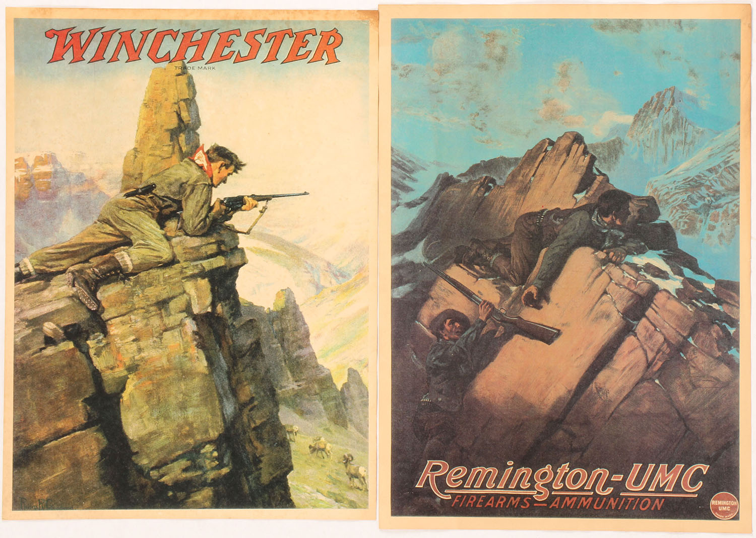Lot of 2 Reproduction Posters/Calendars, one Winchester, one Remington, both have light age soiling & staining 15 1/2'' x 11''. Grade: Very Good - Value: 10 to 50