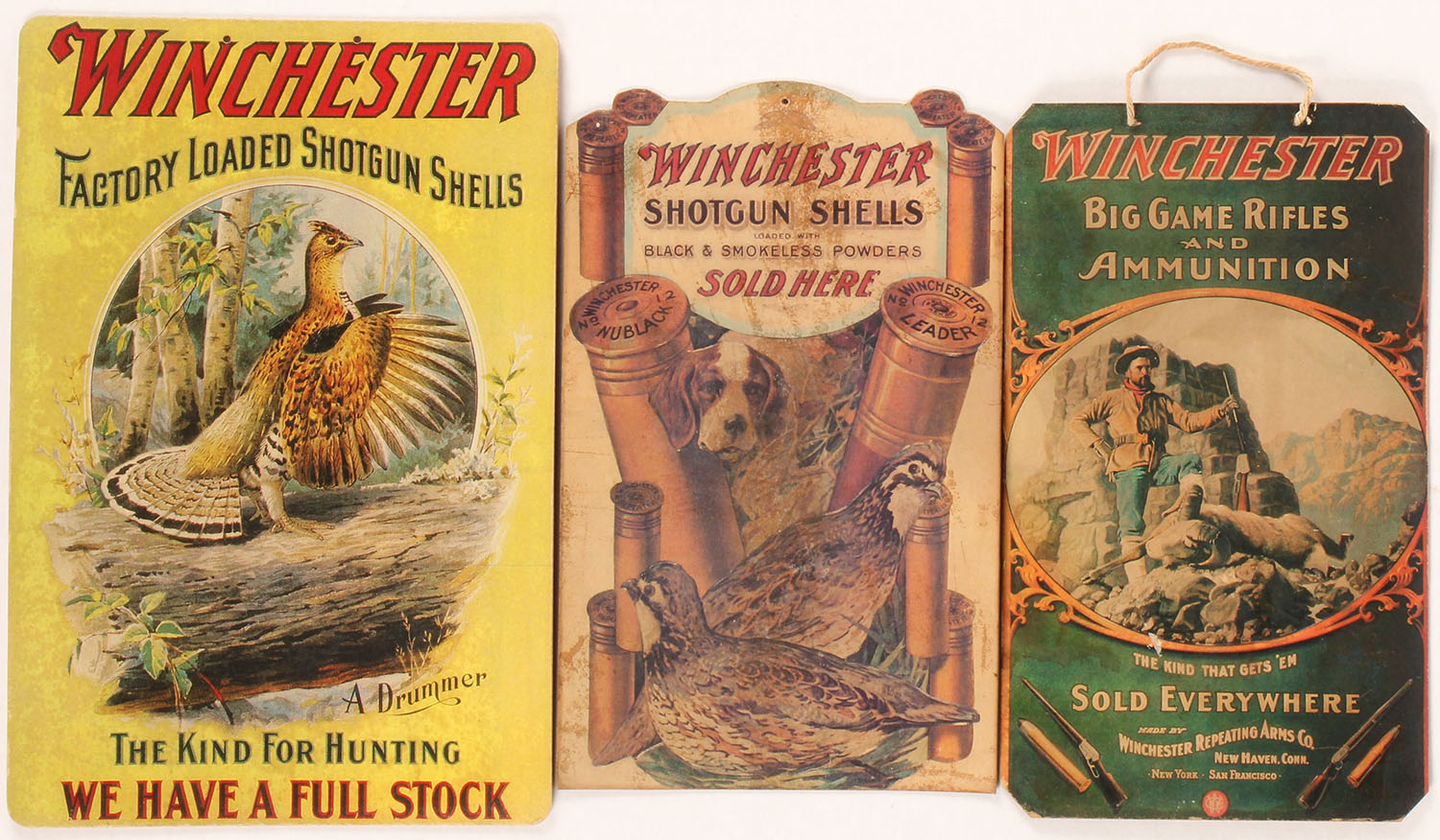 Lot of 3 Reproduction Winchester DieCuts, all different images, all have slight warping, with staining & age light age soiling, all have hanging holes, yellow piece is 12'' x 8'', green piece is 10 3/4'' x 6 1/4'', red piece is 10 1/2'' x 6 1/2'', all nice images with good colors. Grade: Very Good - Value: 40 to 120