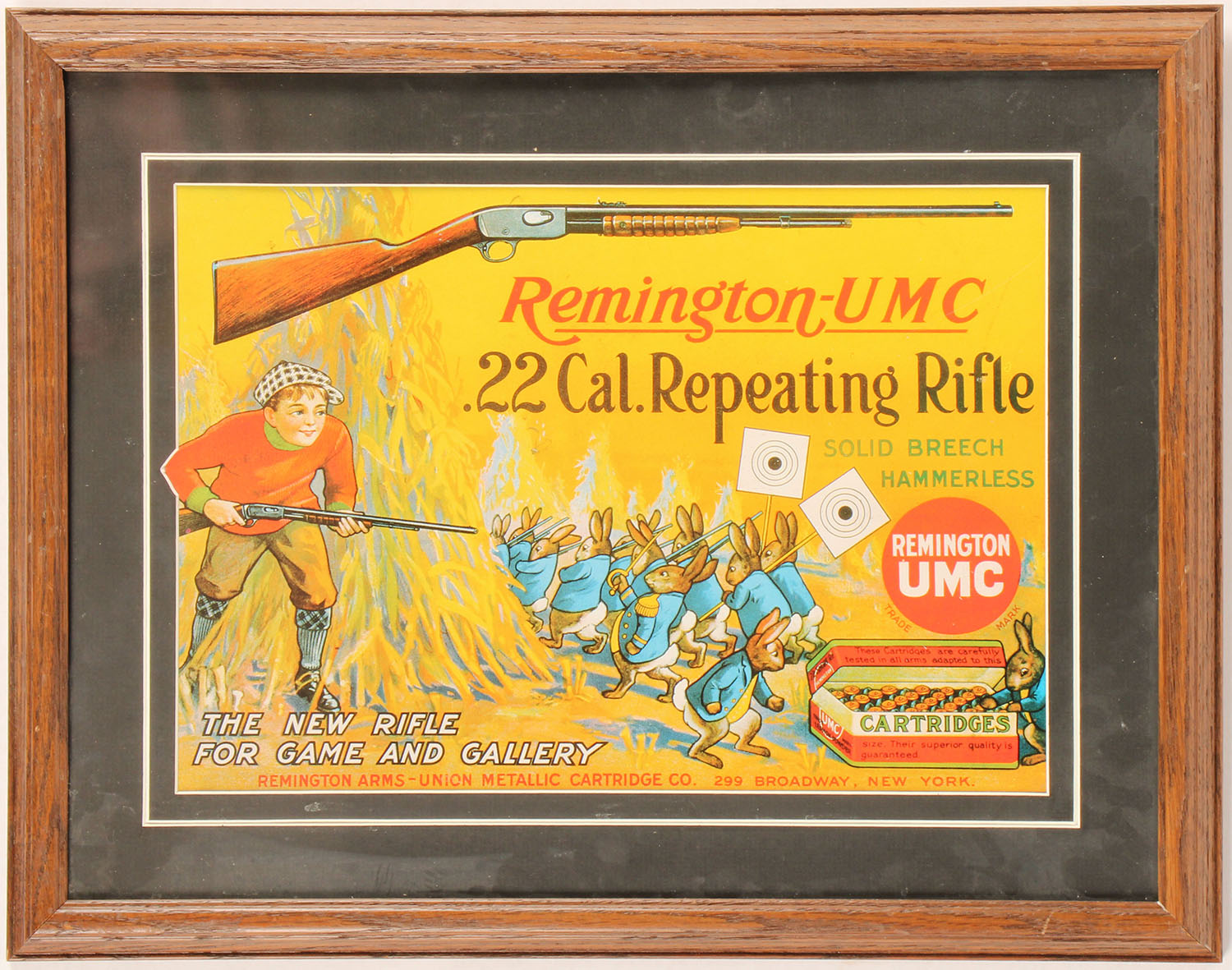 Remington-UMC . 22 Cal Repeating Rifle Tin Sign, printed on tin, features a full color image of a Remington Model 12A, a boy stalking a group of blue coat rabbits & a Rem-UMC 2-piece 22 box, nicely framed, matted, excellent colors, 14'' x 10''. Grade: Excellent - Value: 50 to 100