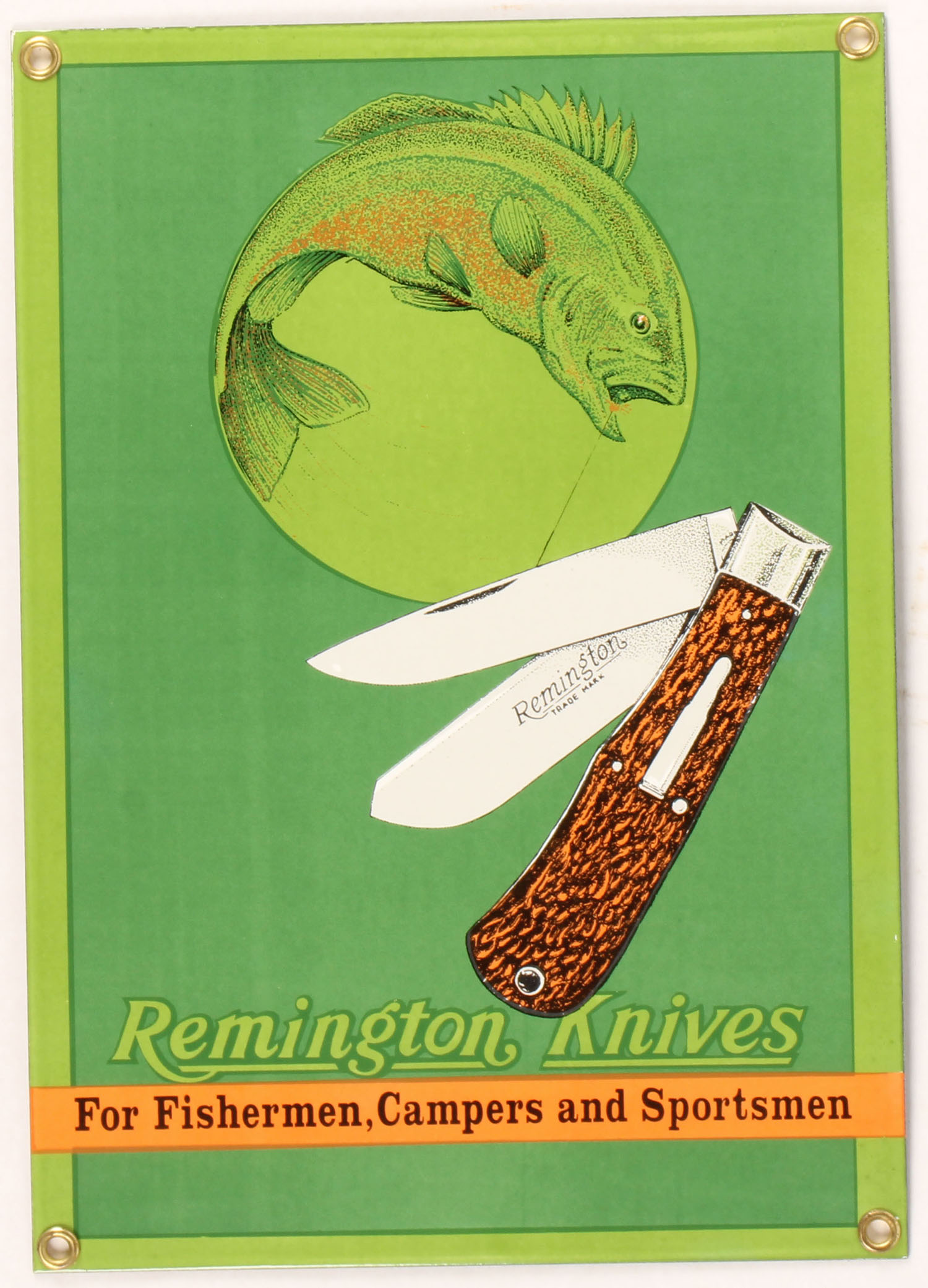 Vintage Remington Knives Porcelain Metal Sign, ''FOR FISHERMEN, CAMPERS AND SPORTSMAN'', multi-color sign, excellent images & colors, features a hooked fish & remington folding knife, 13 1/2'' x 9 1/2''. Grade: MINT - Value: 100 to 300