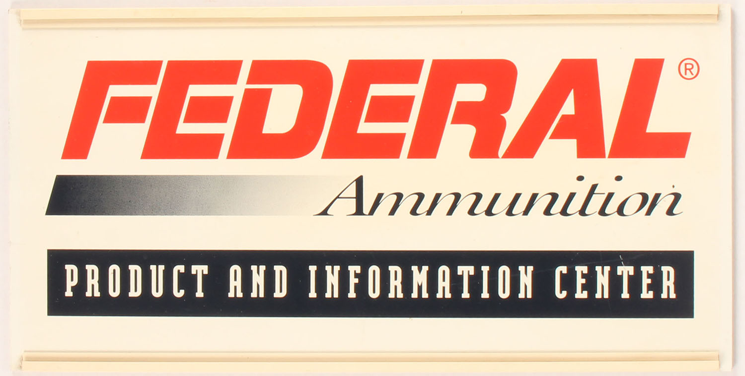 Federal Ammunition Wood Sign, ''PRODUCT AND INFORMATION CENTER'', white/blue/red sign, one sided, light scuffs & scrapes throughout, top plastic is cracked, but in tact, bright colors, 24'' x 12''. Grade: Very Good ++ - Value: 20 to 80
