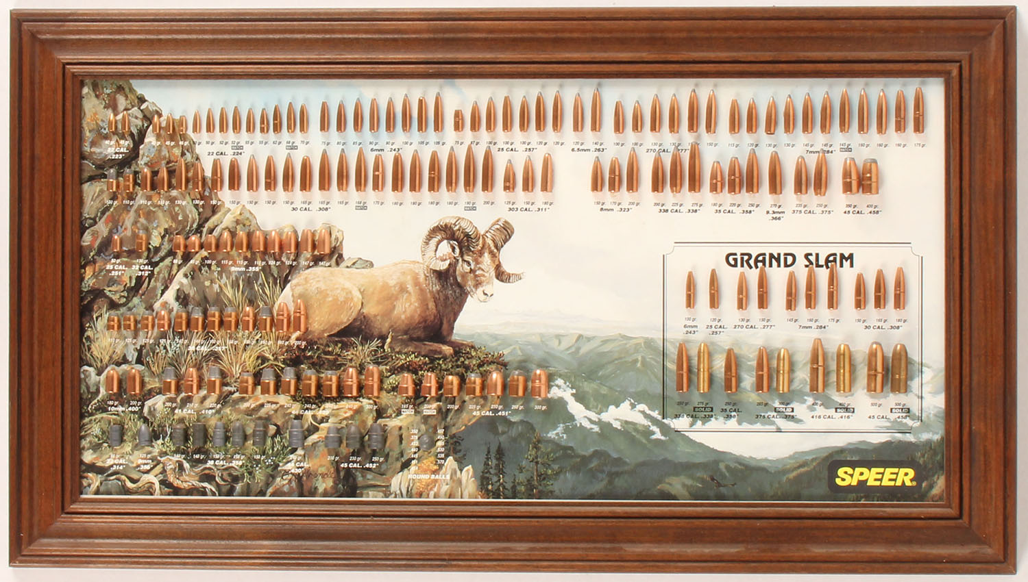 Speer Bullet Board, 1989, all bullets are well secured to the board, bullet condition is excellent, nicely framed, 27'' x 15''. Grade: Excellent ++ - Value: 150 to 300