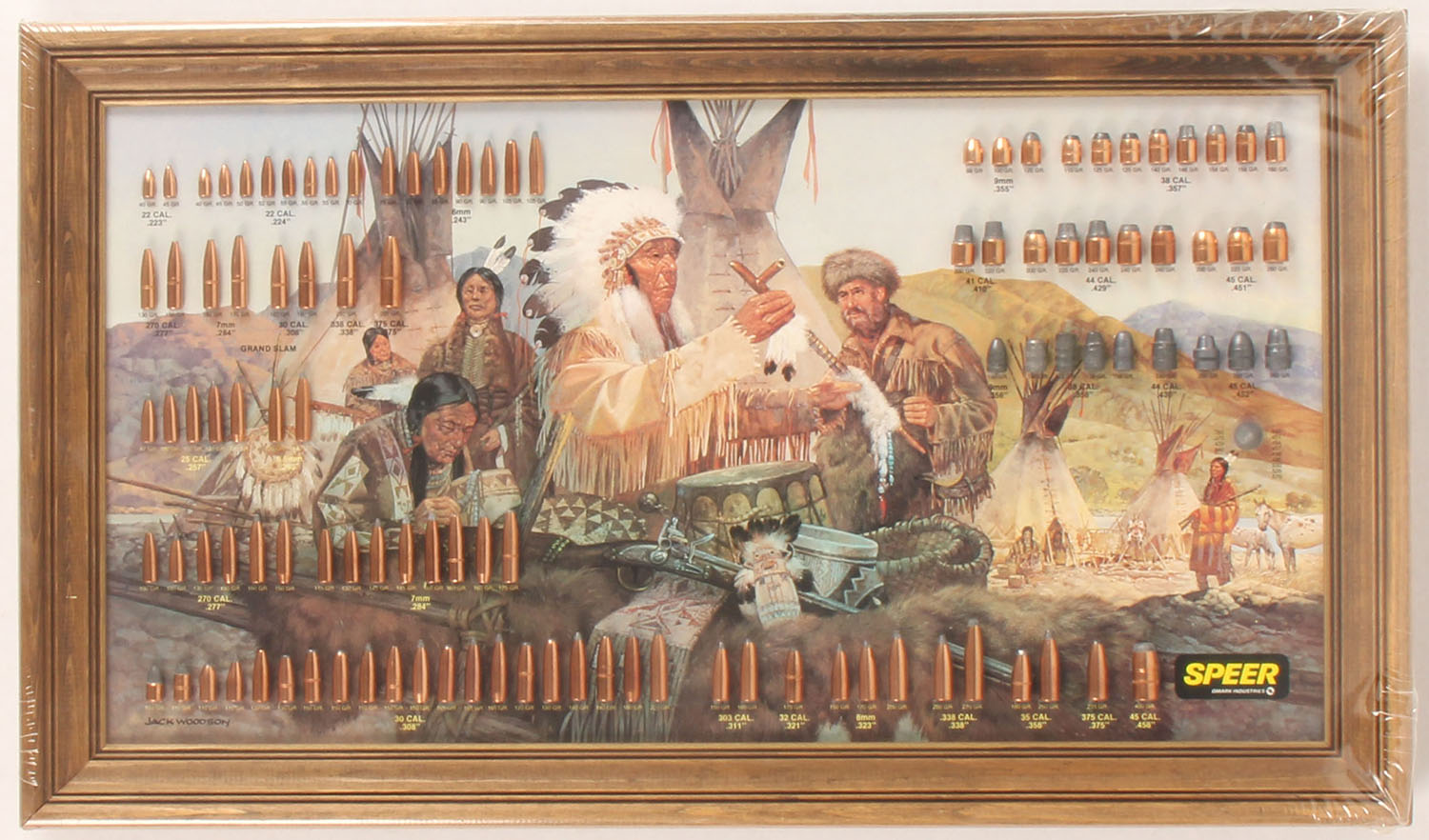 Speer Bullet Board, all bullets are well secured to the board, bullet condition is excellent, full color background image by Jack Woodson, framed, still wrapped in plastic, 24 '' x 14''. Grade: Excellent++ - Value: 150 to 300