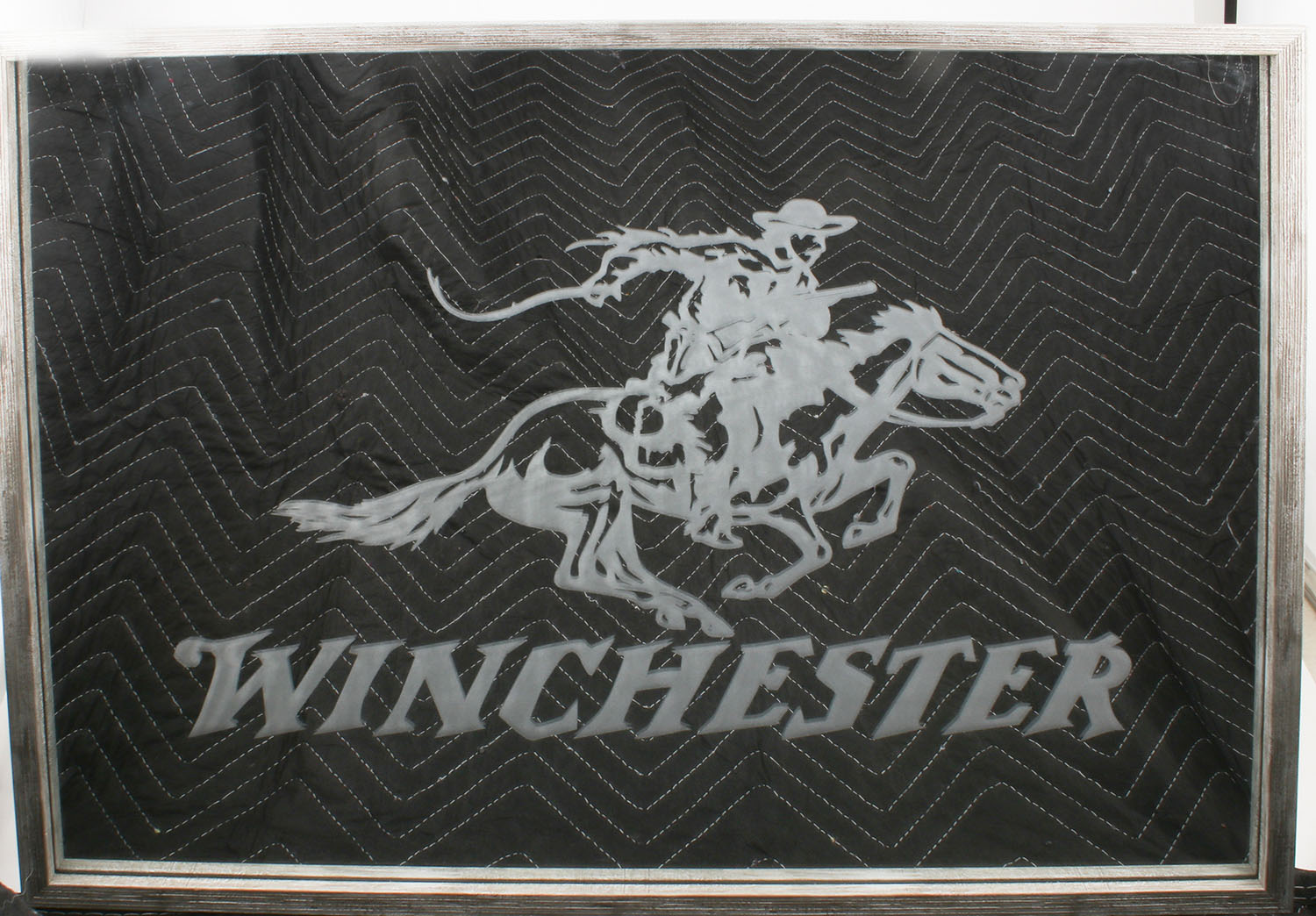 Vintage Winchester Repeating Arms Co. Mirror Sign, features the Winchester horse & rider in silver, overall excellent, framed, 29'' x 23''. (Note: The black & white wavy image in the mirror is simply a reflection of the foreground of the photo,) Grade: Excellent + - Value: 100 to 300