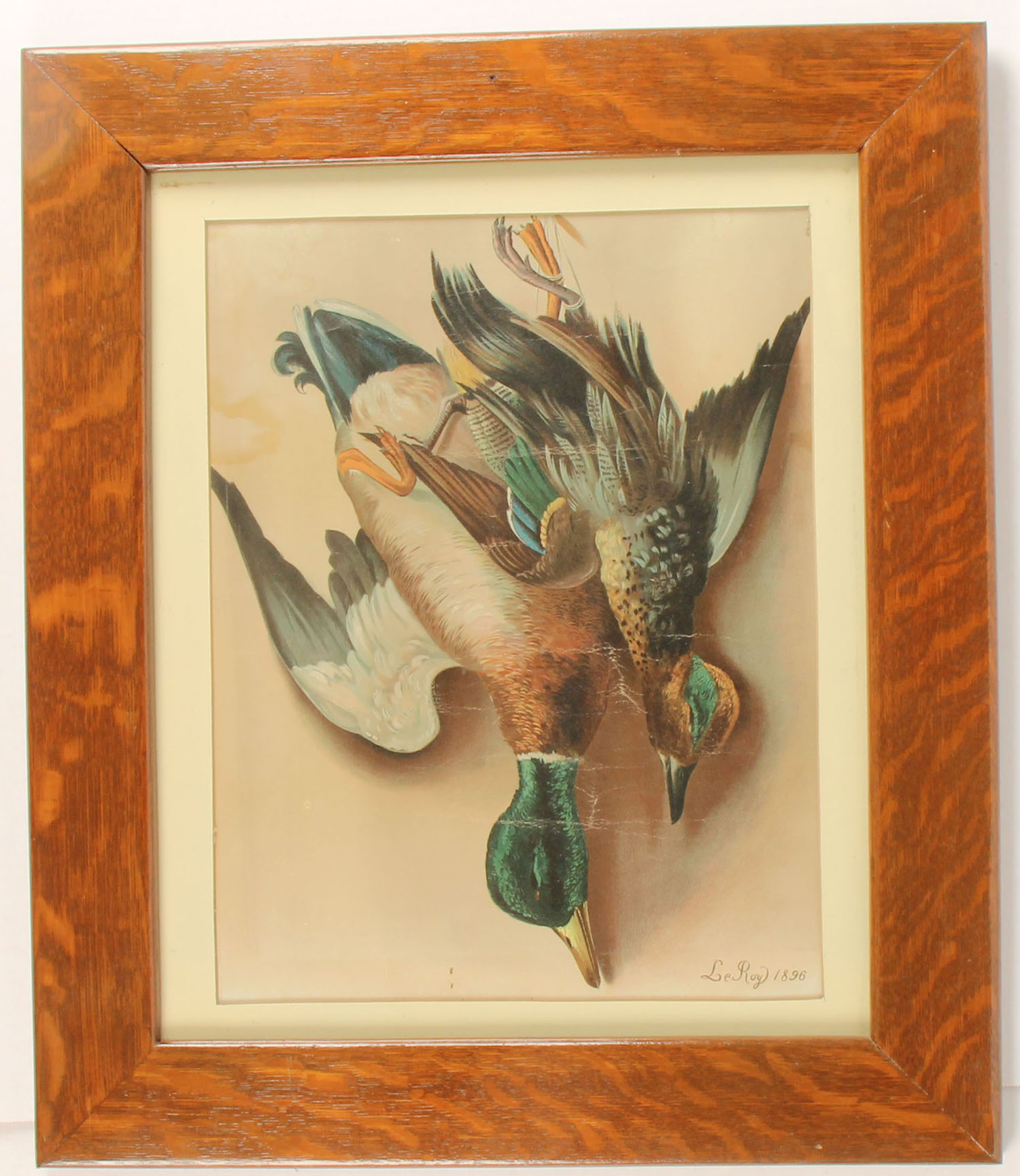 Le Roy 1896, oil on canvas, pictures two hanging mallards, one drake & one hen, nice image, good colors, some loss of color where the canvas has wrinkled, framed, 27'' x 24'' w /frame. Grade: Very Good ++ - Value: 50 to 250