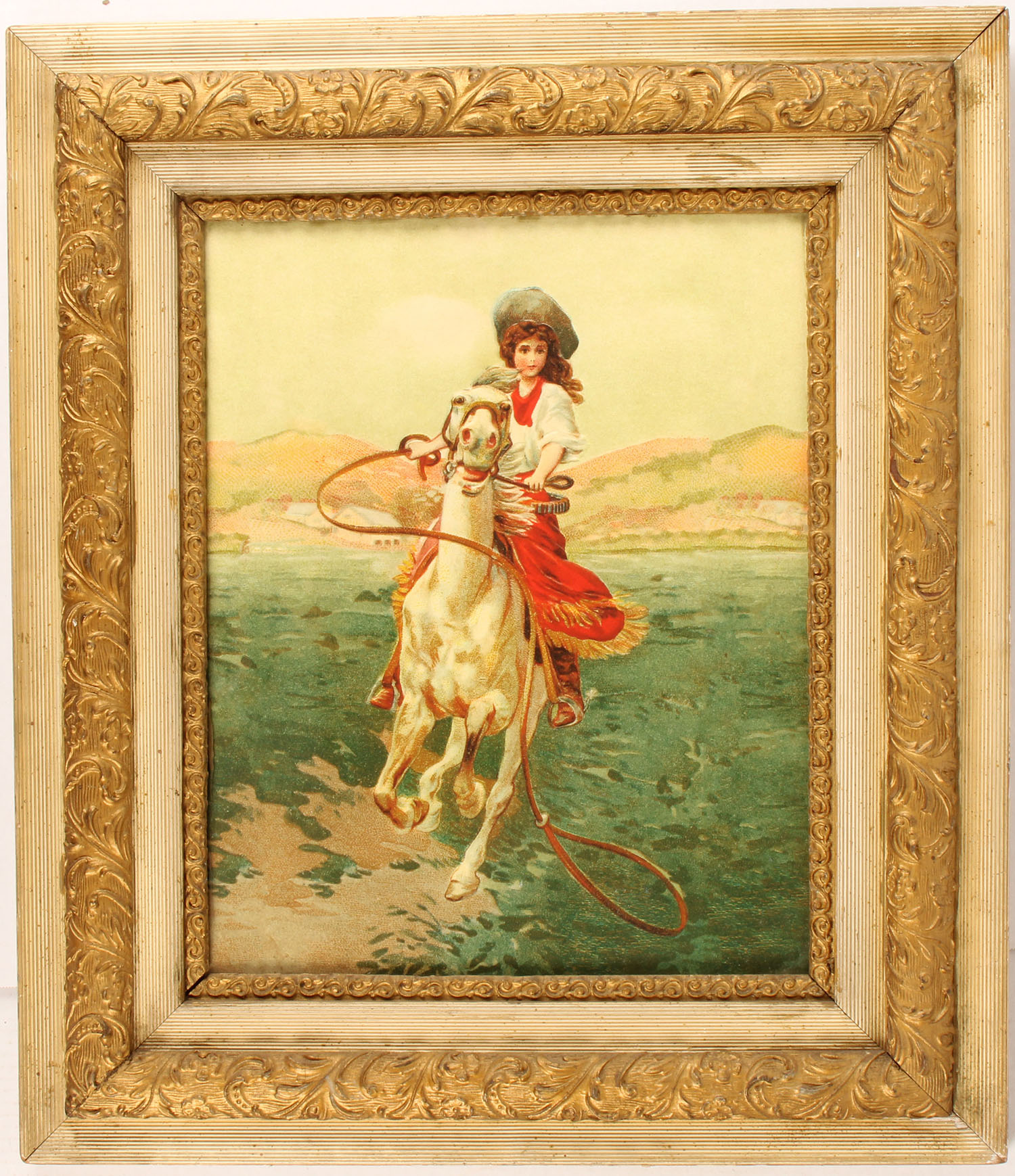 Reproduction Print of a cowgirl with a flying lasso, good colors, nicely framed, 30'' x 26'' w/frame. Grade: Excellent - Value: 20 to 100