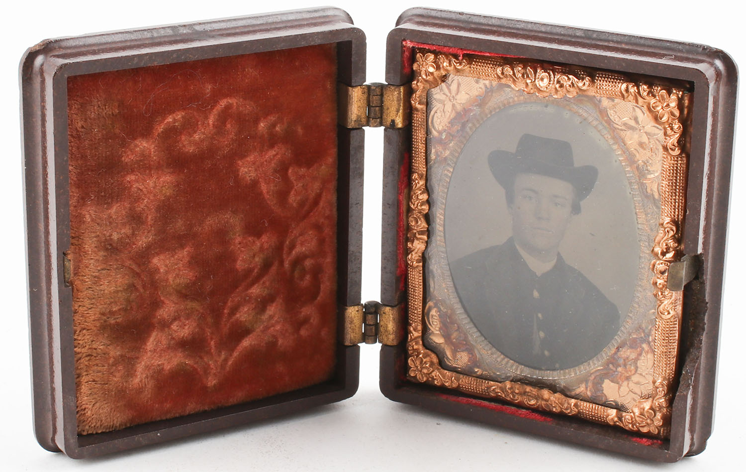 Antique Civil War Thermoplastic Photo Case. These cases were popular particularly before & during the Civil War. They held early forms of photography like daguerreotypes, ambrotypes & tintypes. The cases were made of a mix of shellac & wood fiber. They were also known as Union Cases (named for the ''union'' of the two materials). The material was developed circa 1850 & could be heated & pressed into moulds. Small chip next to latch, otherwise in great condition. 3'' x 2 1/2'' . These are fairly scarce & desirable by Civil War era collectors. Grade: Good ++ - Value: 100 to 300