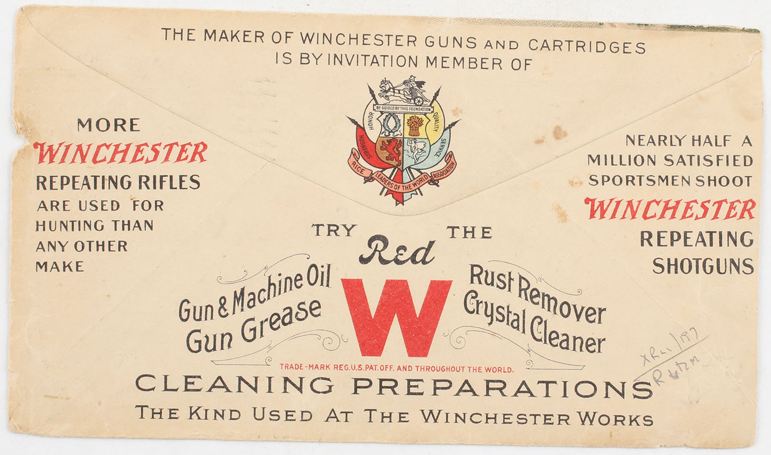 Winchester Rifles & Shotguns Envelope, ''MADE FOR ALL KINDS OF SHOOTING'', 1916, fantastic full color image of a hunter snowshoeing, light age soiling, a couple small edge tears. Grade: Very Good++ - Value: 20 to 80