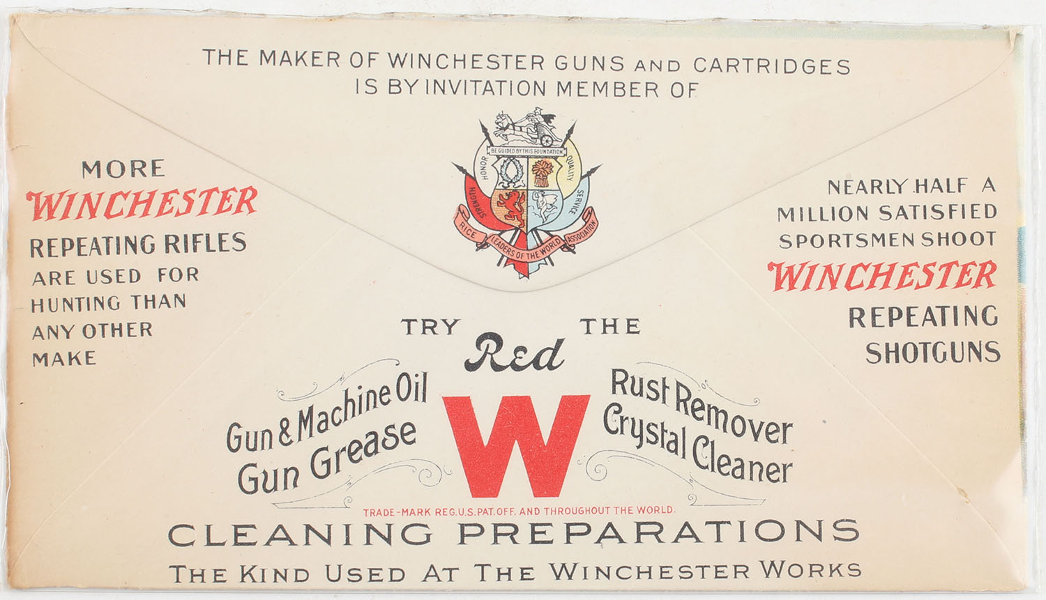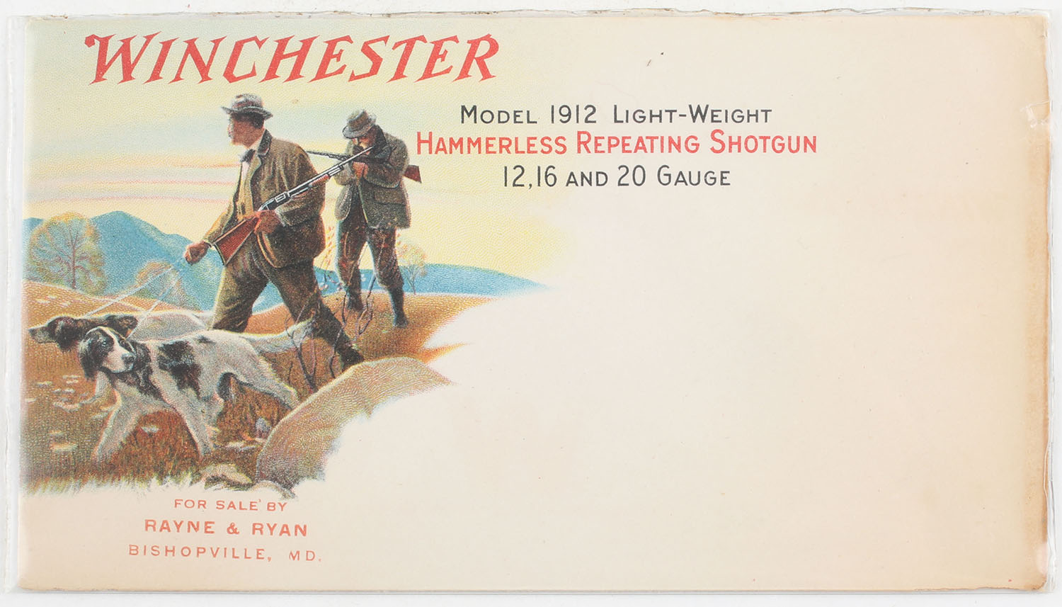 Winchester Envelope, ''MODEL 1912 LIGHT-WEIGHT HAMMERLESS REPEATING SHOTGUN 12,16 AND 20 GUAGE'', unused, no date, great full color image of two bird hunters & two pointers, light staining to the right side & small separation to the right crease, a couple small edge tears. Grade: Excellent - Value: 40 to 120