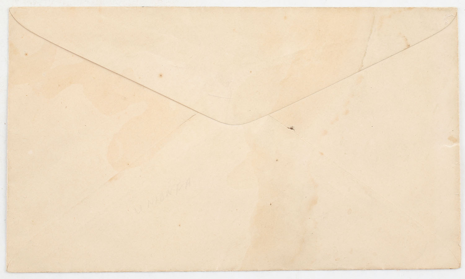 The Union Firearms Co. Envelope, ''SIX SHOTS IN FOUR SECONDS'', pictures a red double barrel & pump action, pencil writing on the front, faded but visible, light age soiling & small tear to left side, blank back. Grade: Good ++ - Value: 30 to 90