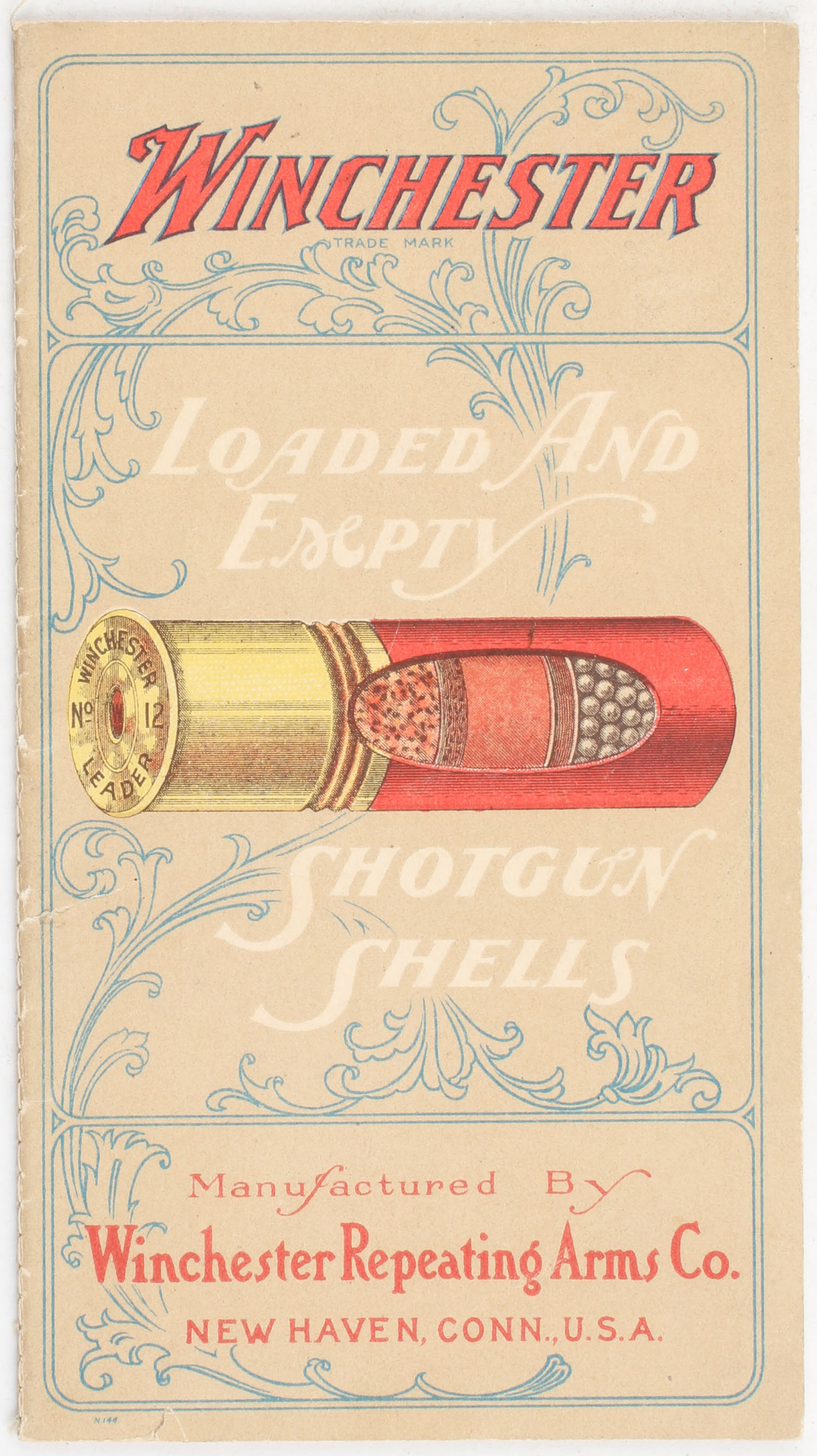 Winchester Booklet, ''LOADED AND EMPTY SHOTGUN SHELLS'' pictures a red leader shotshell on the front cover, a yellow Repeater shotshell on the back, with full color images of shotshells on the inside along with red & black text. Grade: Excellent - Value: 40 to 100