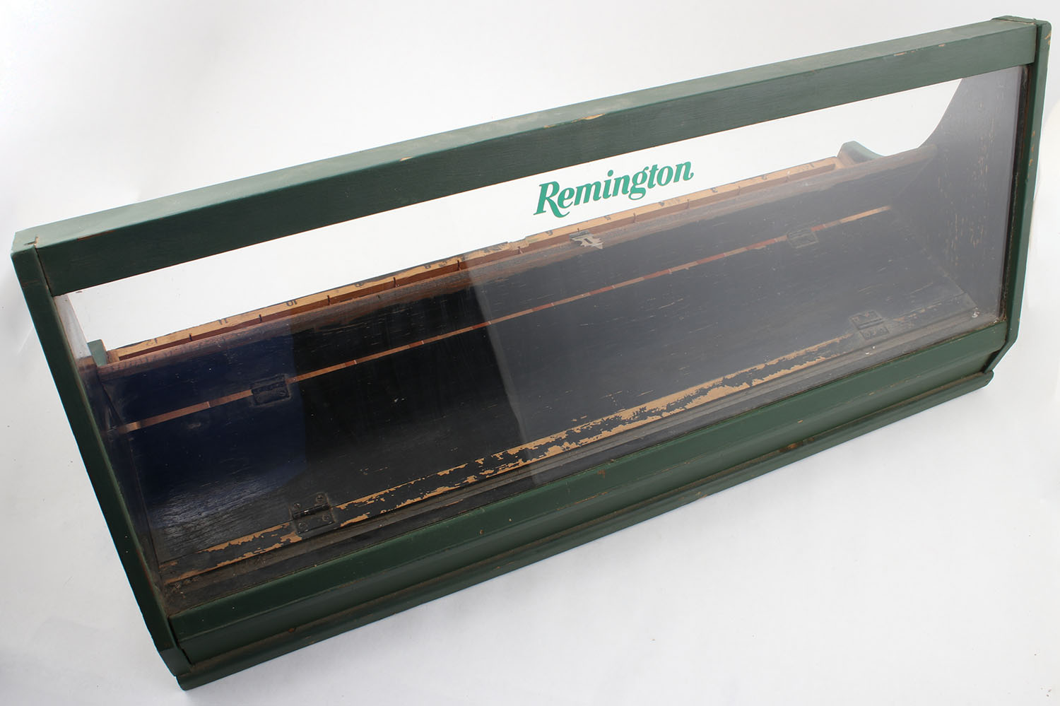 Remington wood and glass display case, has compartment with latch, 10.5'' x 29'' x 12'', Has replaced glass & green paint exterior is a repaint. Missing the knife mounting board behind the glass. Some scuffing to paint but all solid. Grade: Very Good ++ - Value: 100 to 400