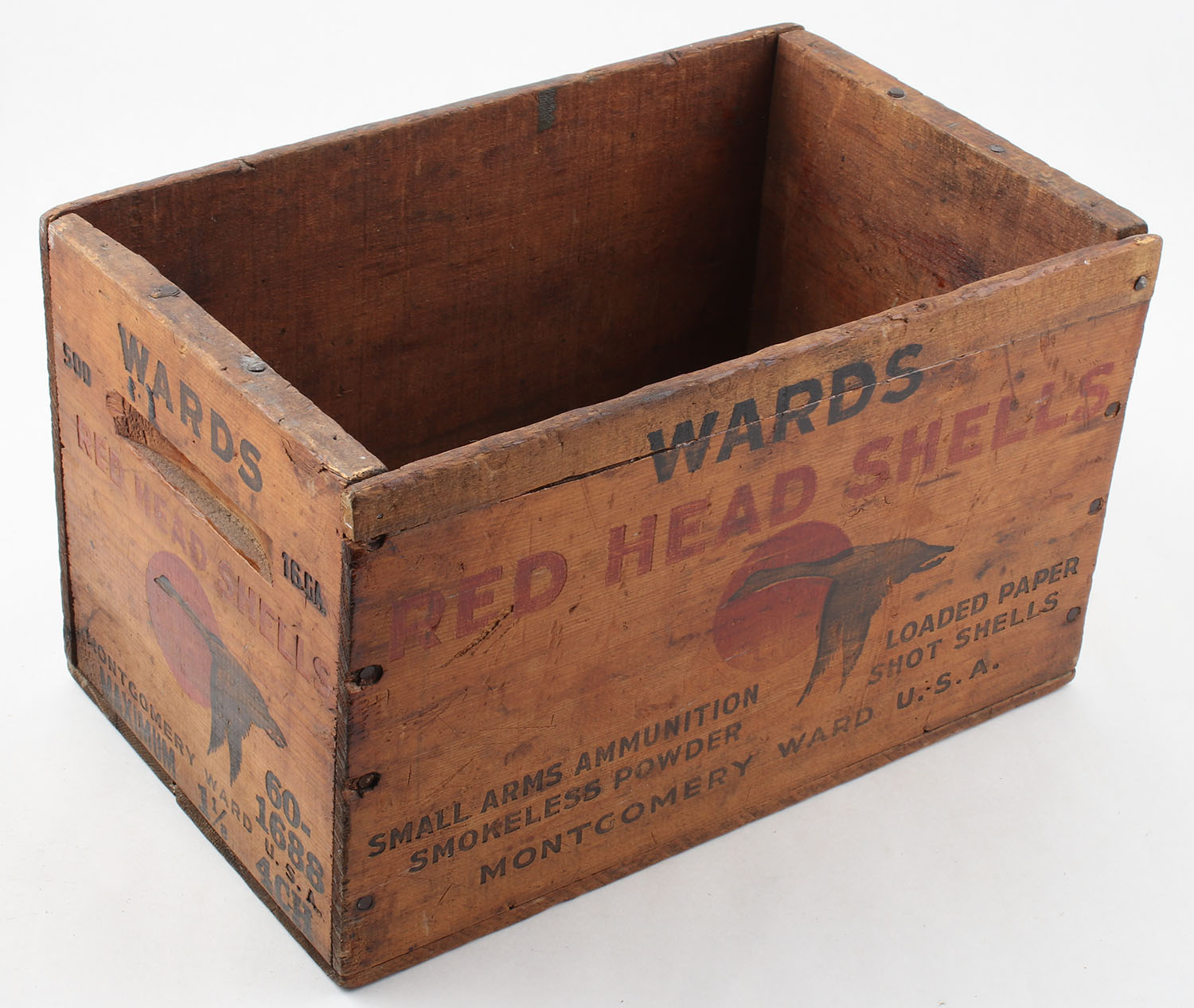 WARDS wood shipping crate, Circle Flying goose logo, Redhead shells, 16 ga., 4 shot, nail construction, black & red print is solid, crate has age soiling, Grade: Very Good + - Value: 100 to 300