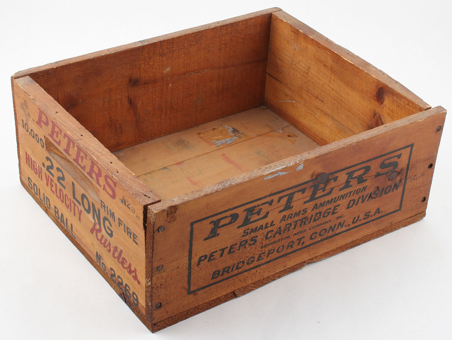 Peters High Velocity .22 Long Rim Fire wood crate, No. 2269, red and black print and crate are solid. Grade: Excellent - Value: 20 to 80