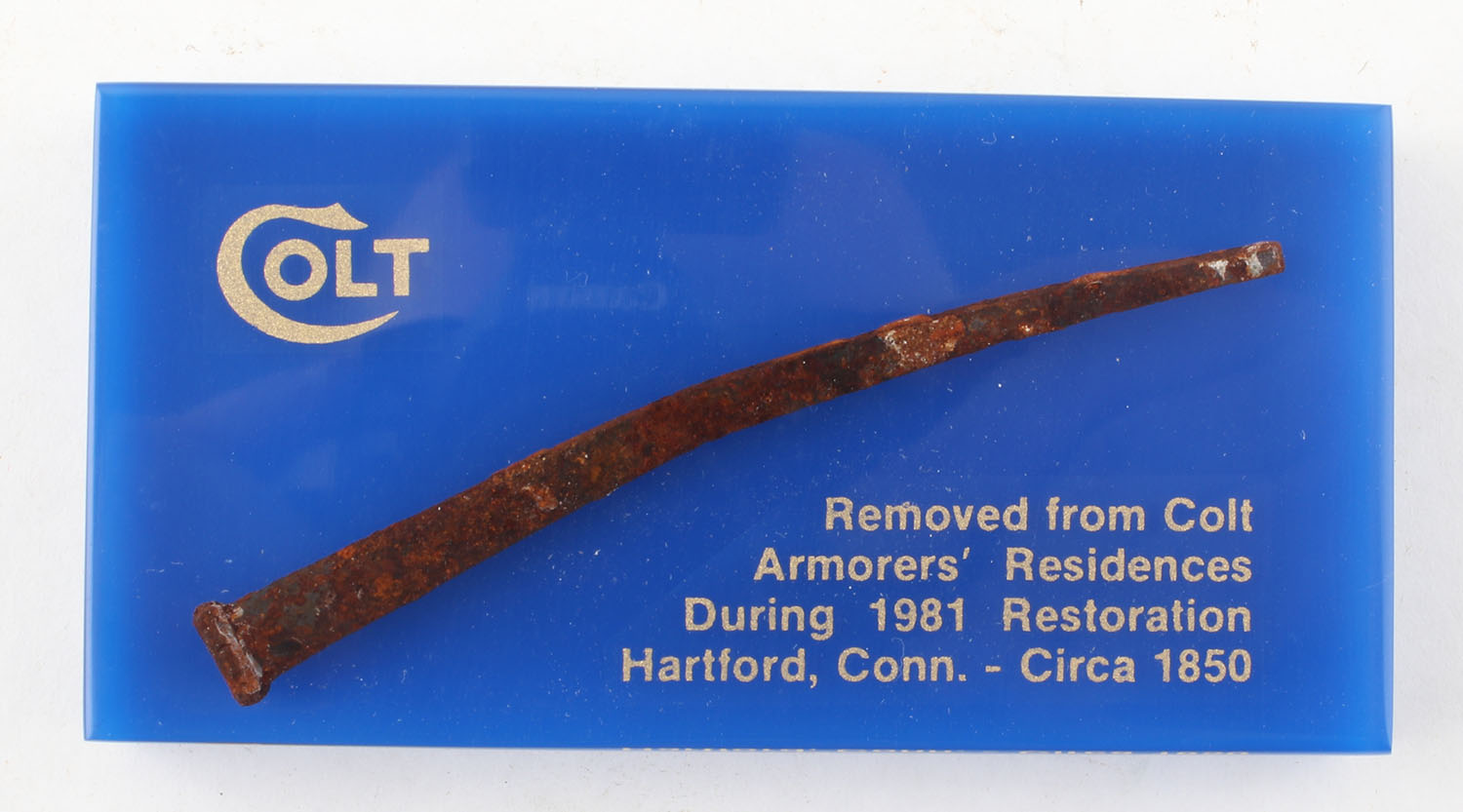 Colt acrylic block, with iron spike internalized & indicating that it was removed from Colt Armorers' Residences during 1981 Restoration, circa 1850. Comes in the correct box. Grade: Excellent - Value: 20 to 50