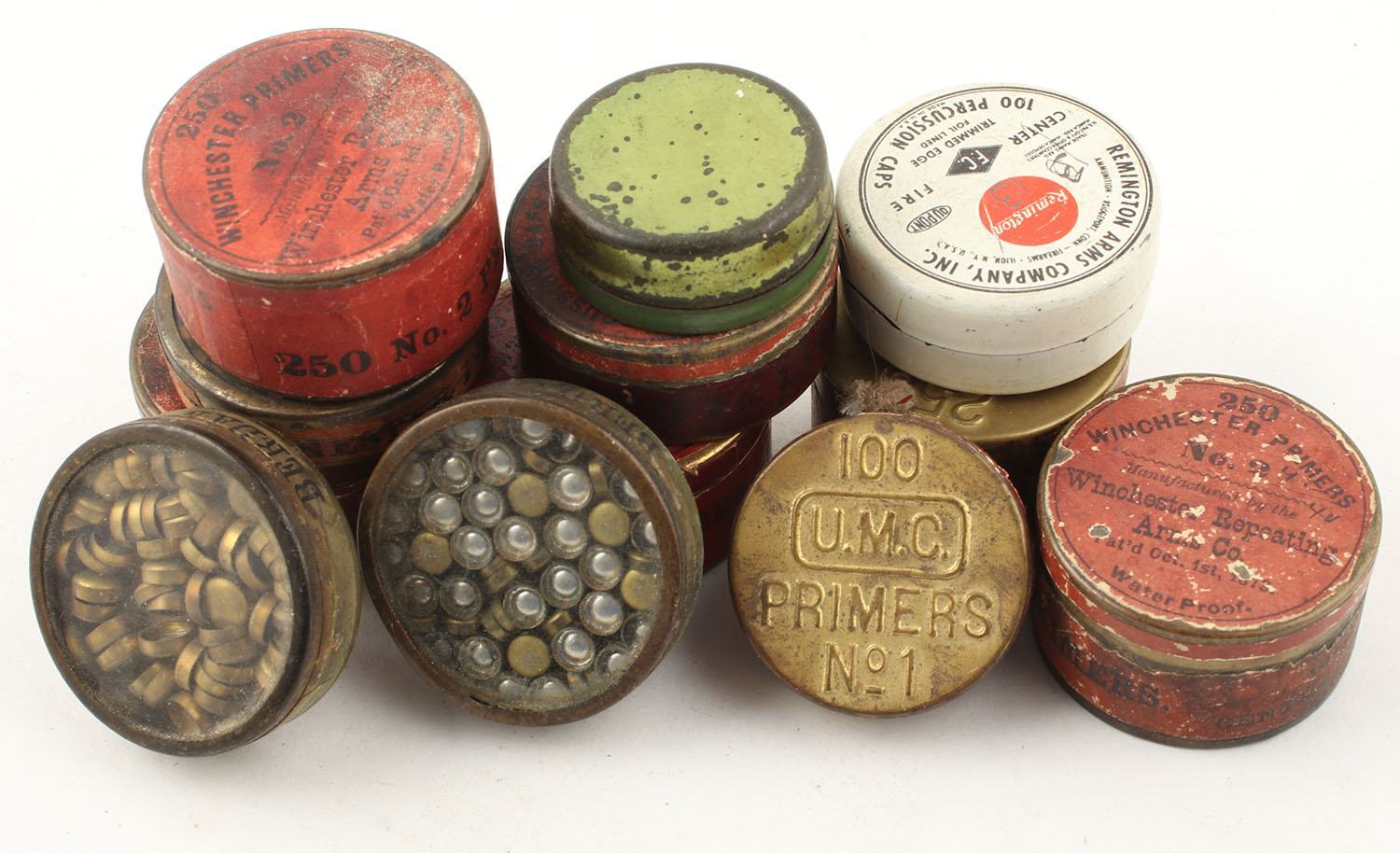 Lot of 12 primer tins, various manfs. 10 partial or Full and 2(Umc 250 count and Peters) empty . Grade: Very Good ++ - Value: 40 to 200