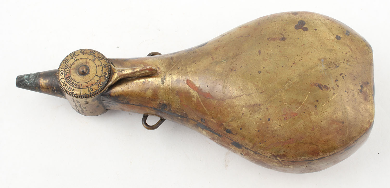 RARE! Mark B Burnham Brass powder flask, made in Savannah, Georgia, this flask dated 1951 and #314, has age soiling. Grade: Excellent - Value: 40 to 80