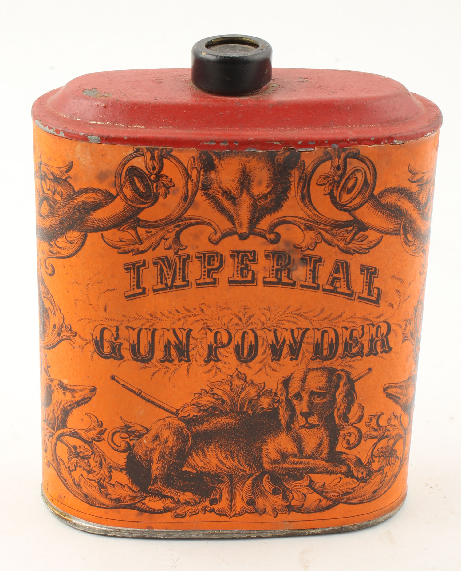 Eureka Powder Works Imperial Gunpowder tin, paper is bright and clean, tin has some scuffing. Grade: Excellent - Value: 50 to 200