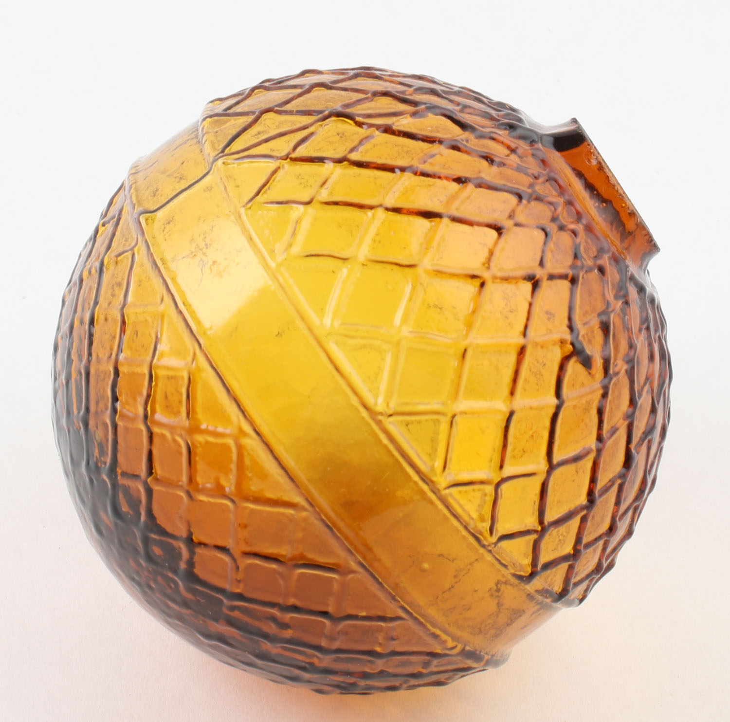 RARE! Amber Glass Target Ball, fishnet design, 3 piece, short neck, wonderful condition. Grade: Excellent ++ - Value: 100 to 300