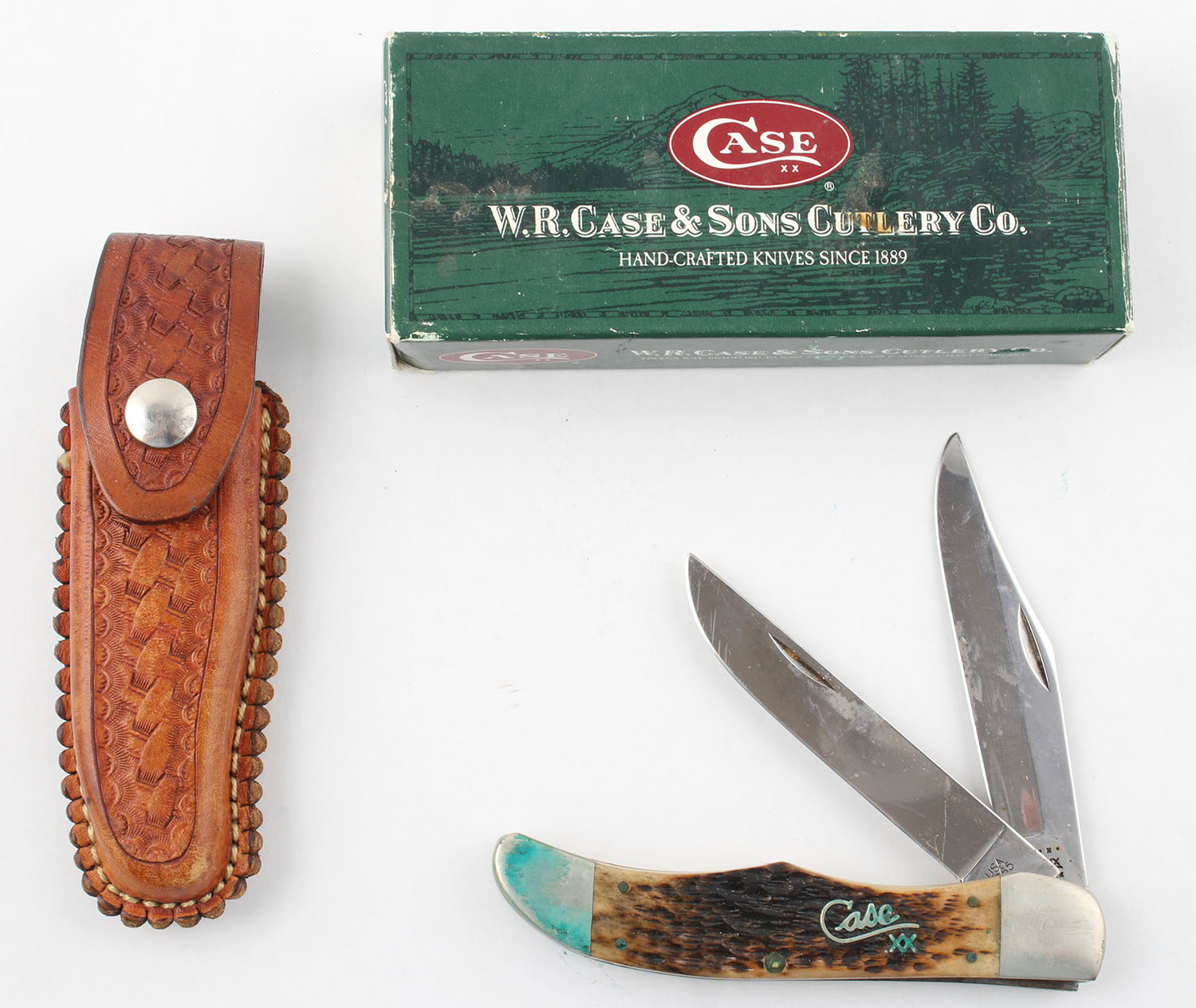 Case knife, Hunter folding, in orignal box, two 3.5'' blades, has leather sheath. Grade: Excellent - Value: 50 to 200