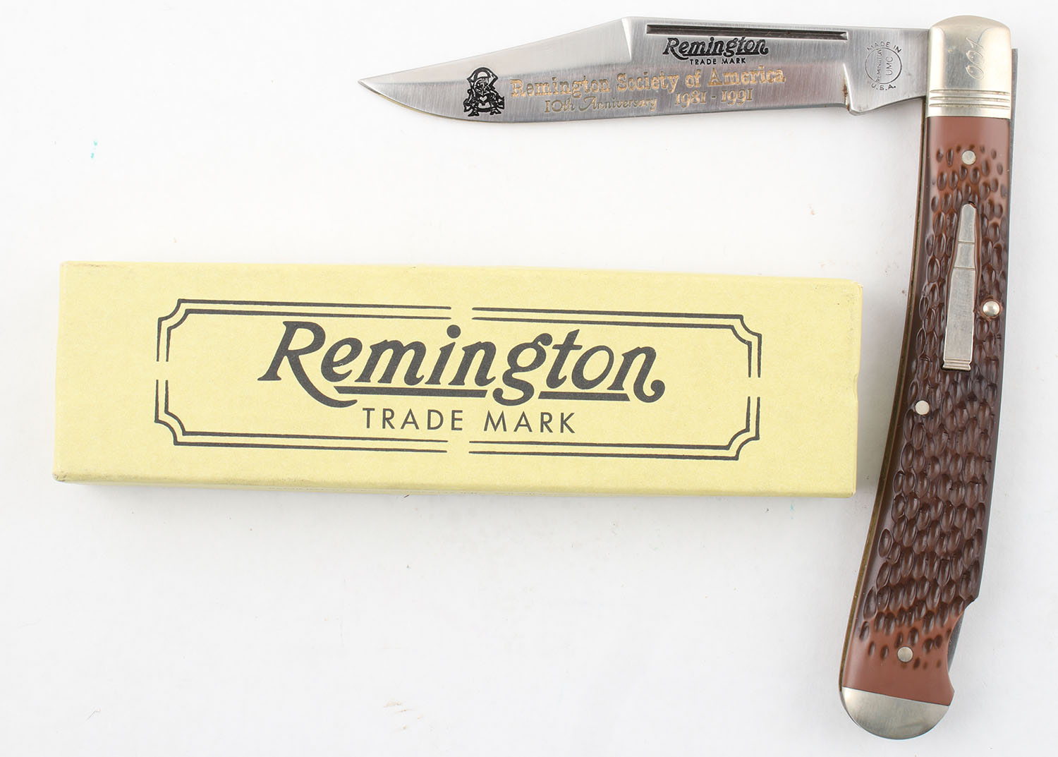 Remington folding knife, 1992 bullet knife, 10th anniversary Remington Society of America, 4'' blade, one R-1253. Grade: Excellent ++ - Value: 40 to 80