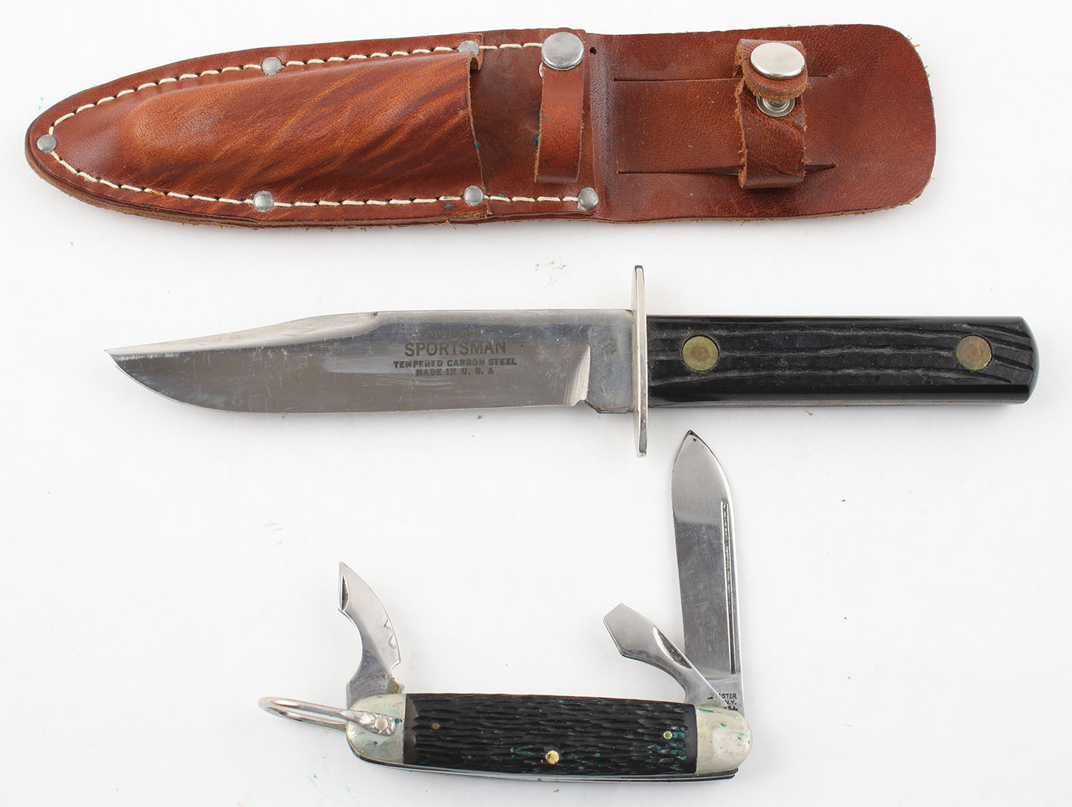 Lot of 2 fixed/folding blade knives, leather sheath. Grade: Excellent - Value: 30 to 90