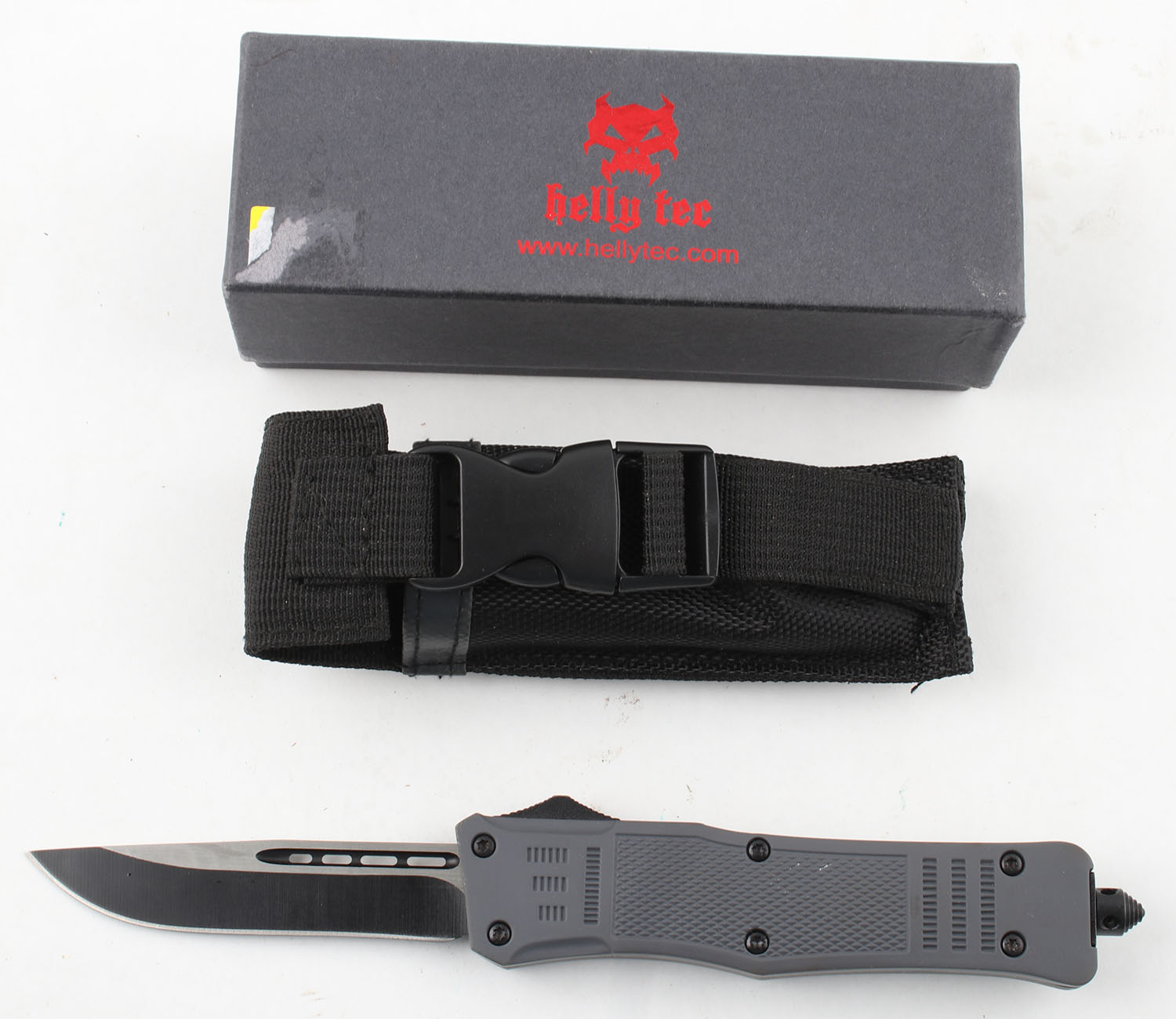 Helly Tec OTF spring assisted knife, has sheath and original box, 4'' blade, blade opens nicely! Grade: Excellent ++ - Value: 50 to 100