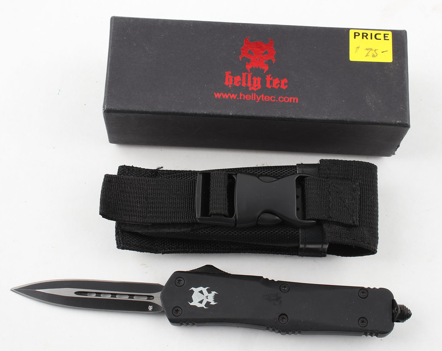 Helly Tec OTF spring assisted knife, has sheath and original box, 4'' blade, blade opens nicely! Grade: Excellent ++ - Value: 50 to 100