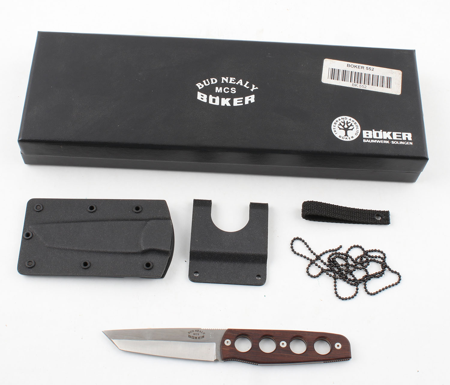 Boker fixed blade knife, in original case, 3'' blade, all bright and clean. Grade: Excellent ++ - Value: 30 to 90