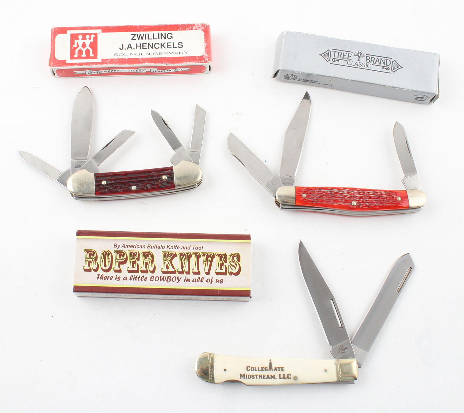Lot of 3 folding knives , in original box, all bright and clean. Grade: Excellent - Value: 40 to 150