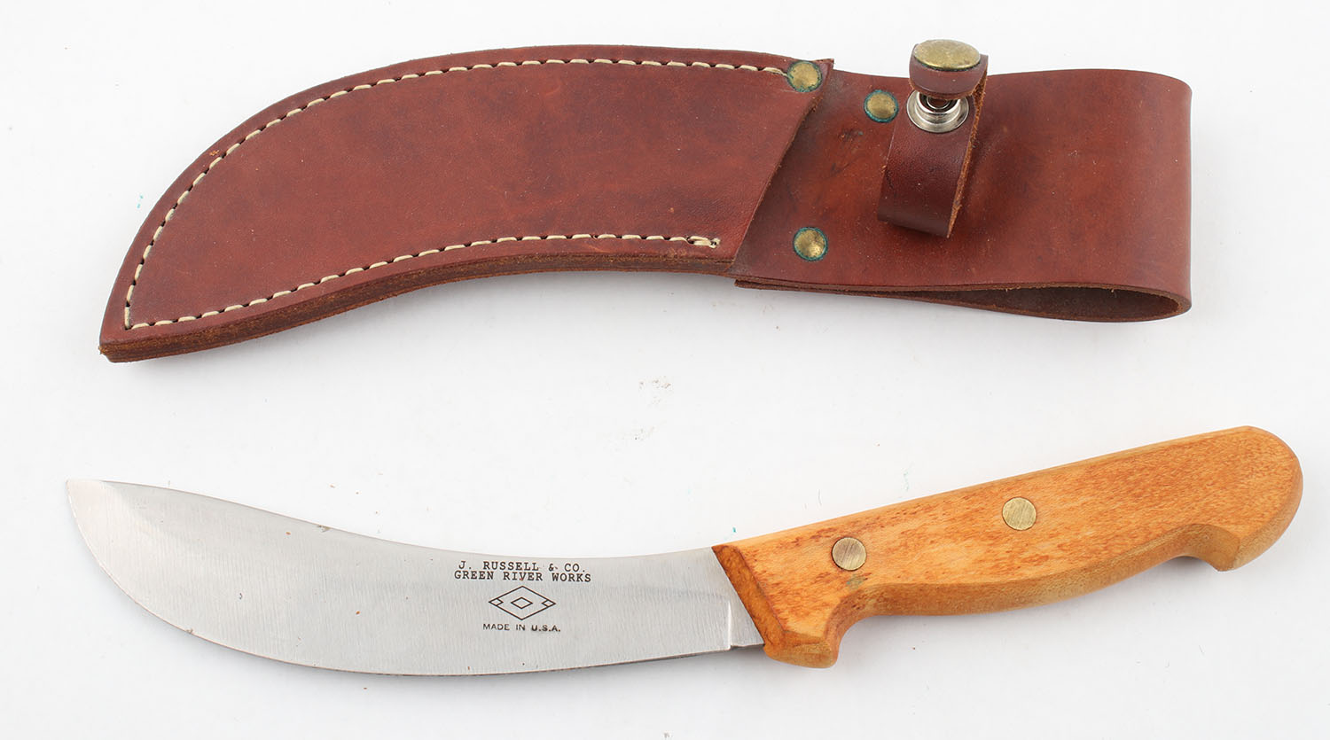 J. Russell & Co Green River Works vintage with Signia, RARE curved blade, Buffalo skinners knife with leather sheath brand new old stock, 11.5'' OAL. Grade: Excellent - Value: 50 to 300