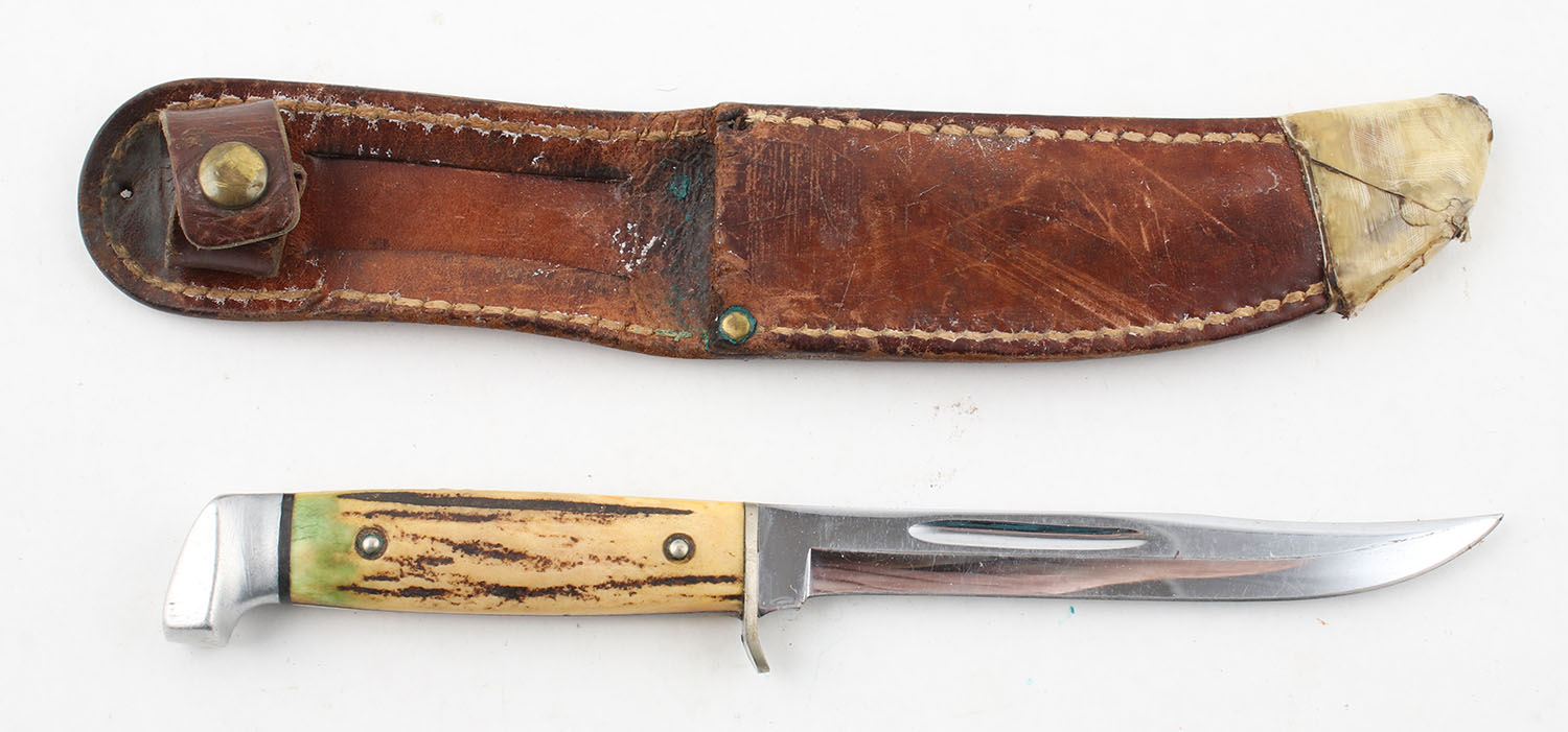 Case knife, fixed 4.75'' blade with leather sheath. Grade: Very Good - Value: 40 to 100
