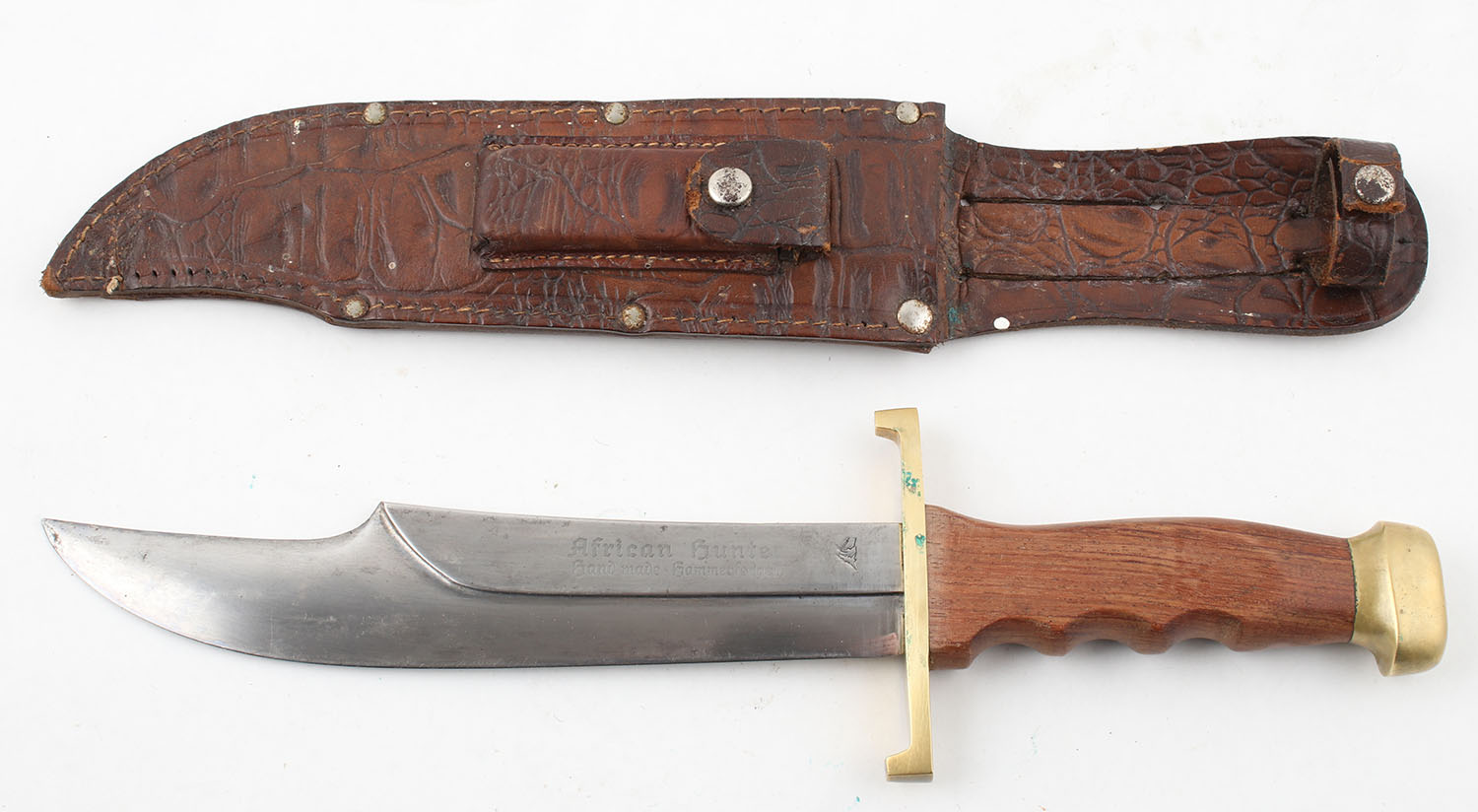 Large Bowie knife, fixed 8'' blade marked African Hunter, wood handle, leather sheath, handmade hammer forged. Grade: Excellent - Value: 50 to 150