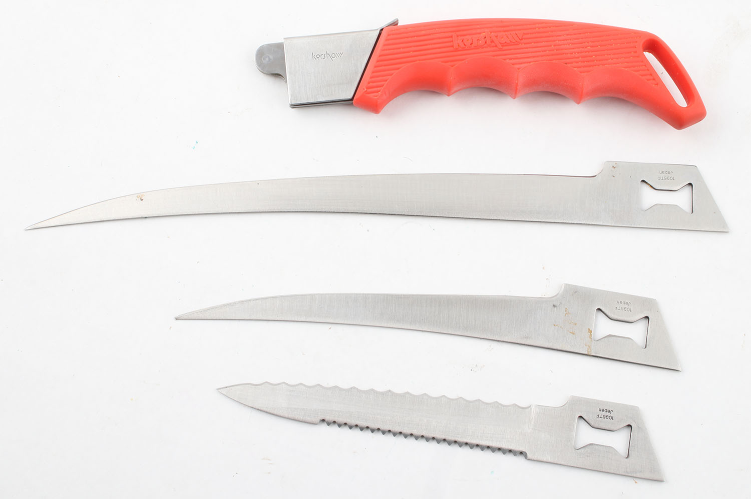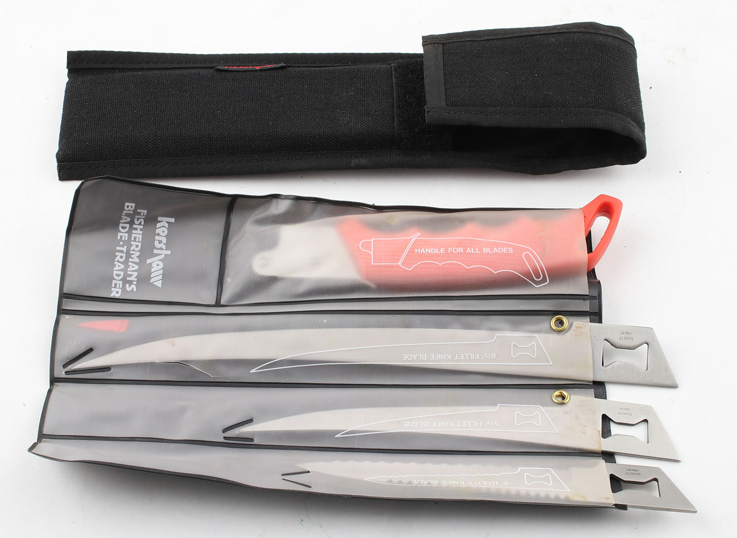 Kershaw Fisherman's Blade Trader knife, multiple fixed blades, has sheath, all bright and clean. Grade: Excellent - Value: 40 to 100