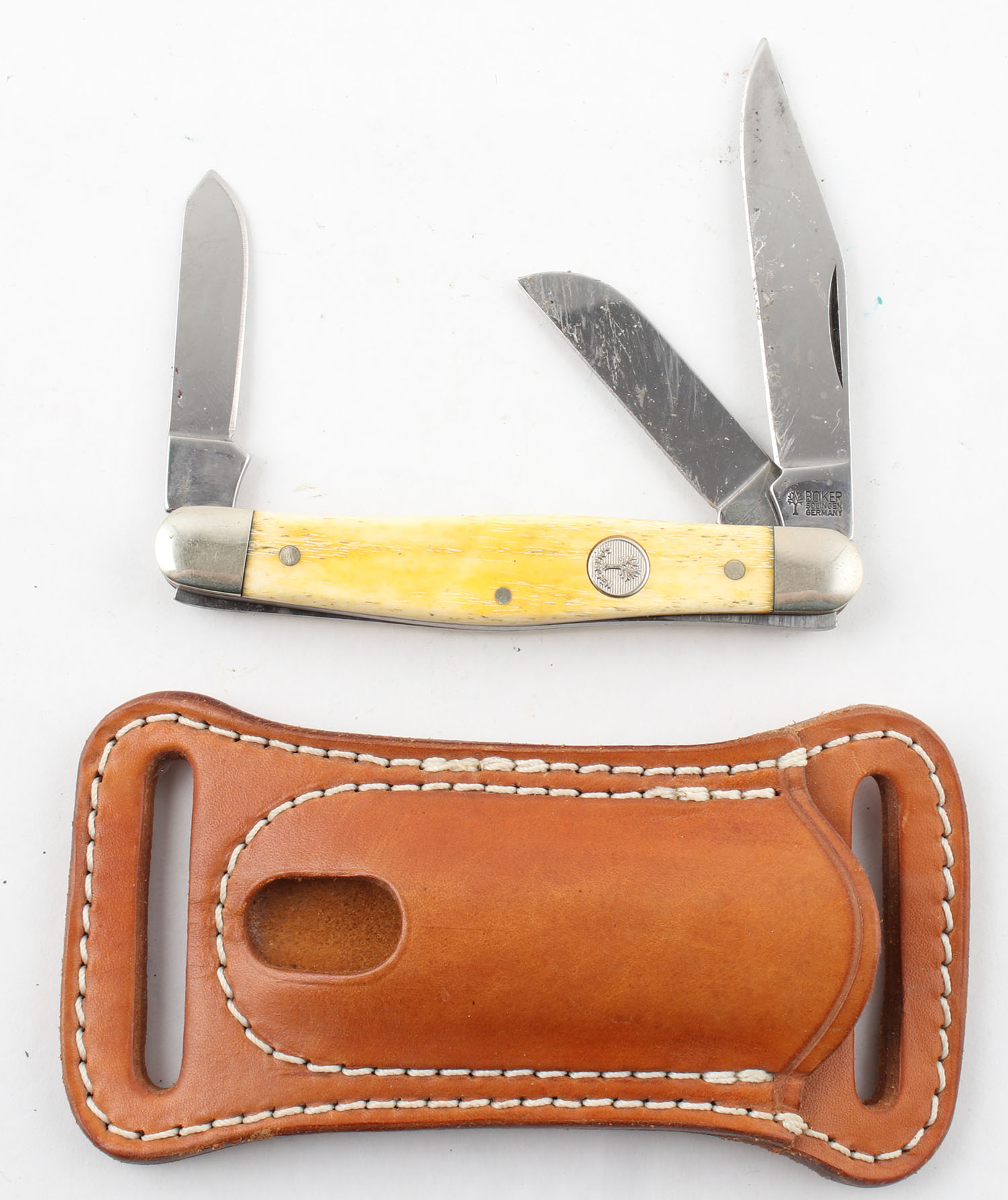 Boker knife, folding 3'' blade, has leather case, has age soiling. Grade: Very Good - Value: 20 to 80