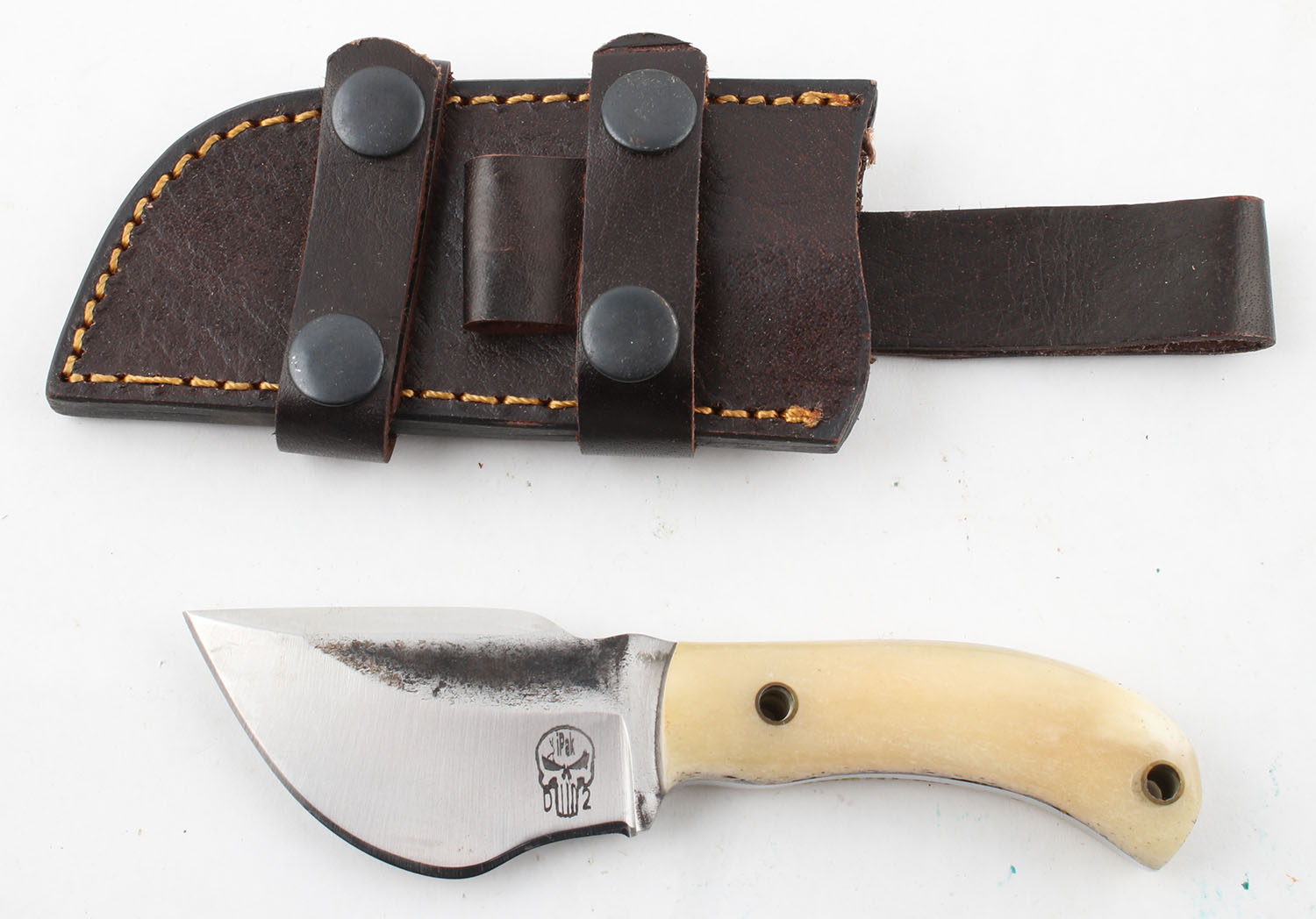 Fixed blade knife, 3'' blade, has leather sheath, bright and clean, blade marked with iPak skull D2 and beautiful handle. Grade: Excellent - Value: 50 to 100