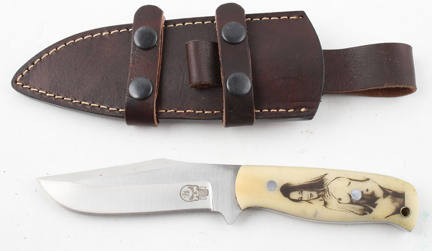 Fixed blade knife, 4'' blade, has leather sheath, bright and clean, blade marked with iPak skull D2 and beautiful handle. Grade: Excellent - Value: 40 to 100
