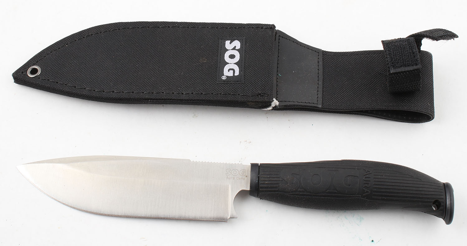 SOG knife, fixed blade, has leather sheath, 5.5'' blade. Grade: Excellent ++ - Value: 30 to 90