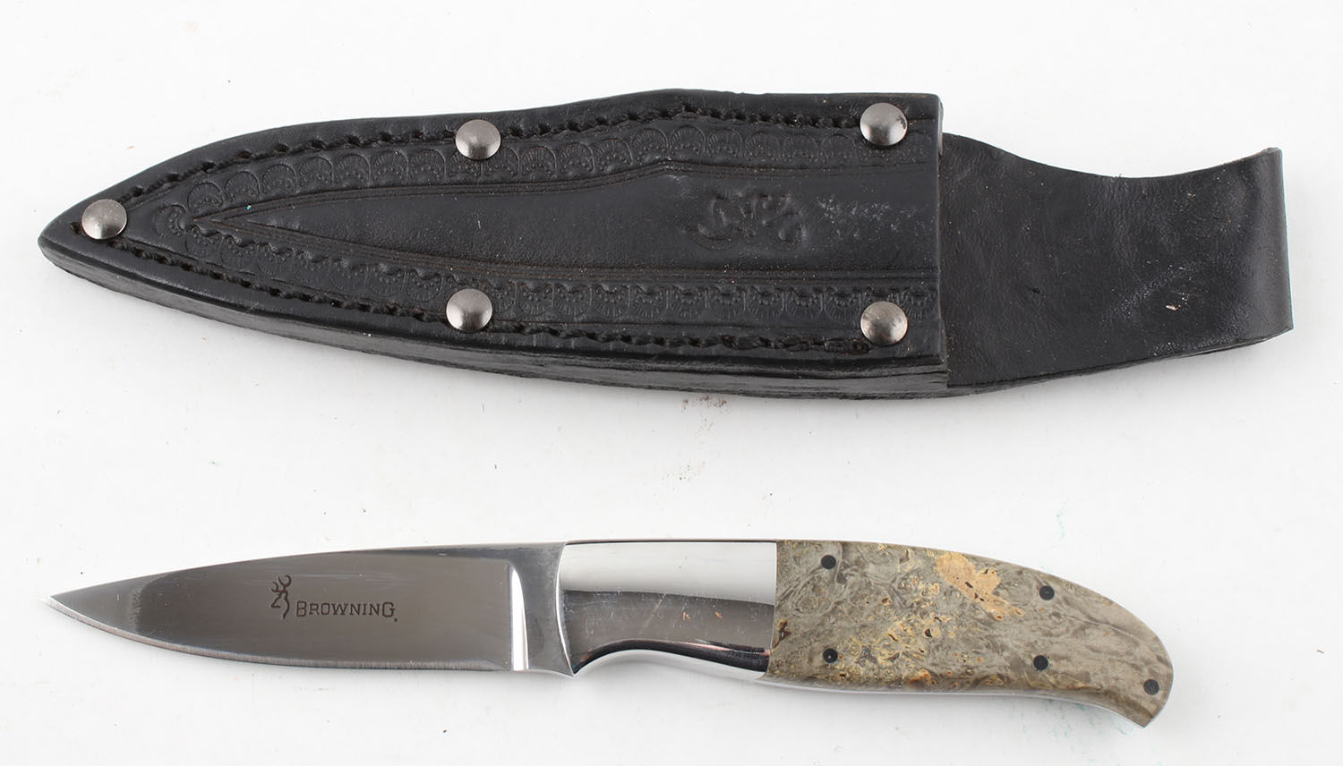 Browning knife, Model 322663 fixed blade, has sheath, 3'' blade. Grade: Excellent ++ - Value: 40 to 80