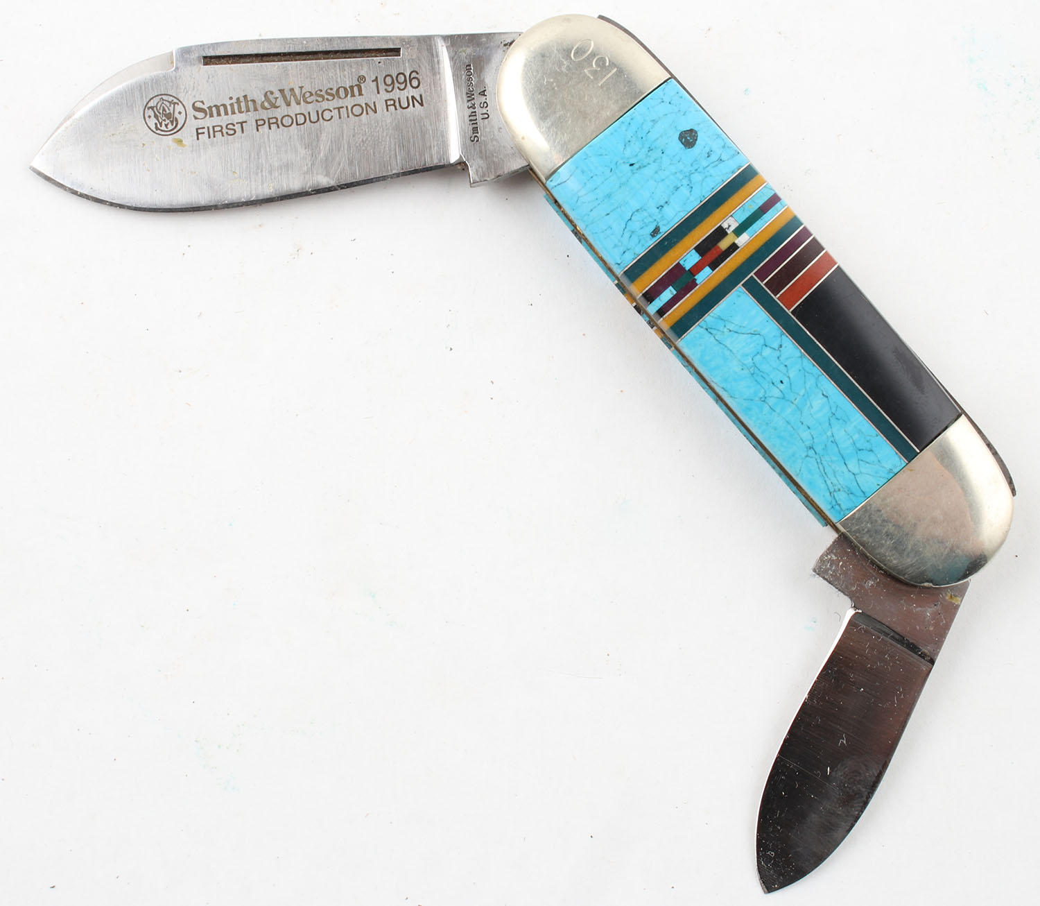 S&W knife, 1996, 2 folding blades, #130, 2.5'' longest blade, beautiful handles, some age soiling to blade. Grade: Excellent - Value: 20 to 80