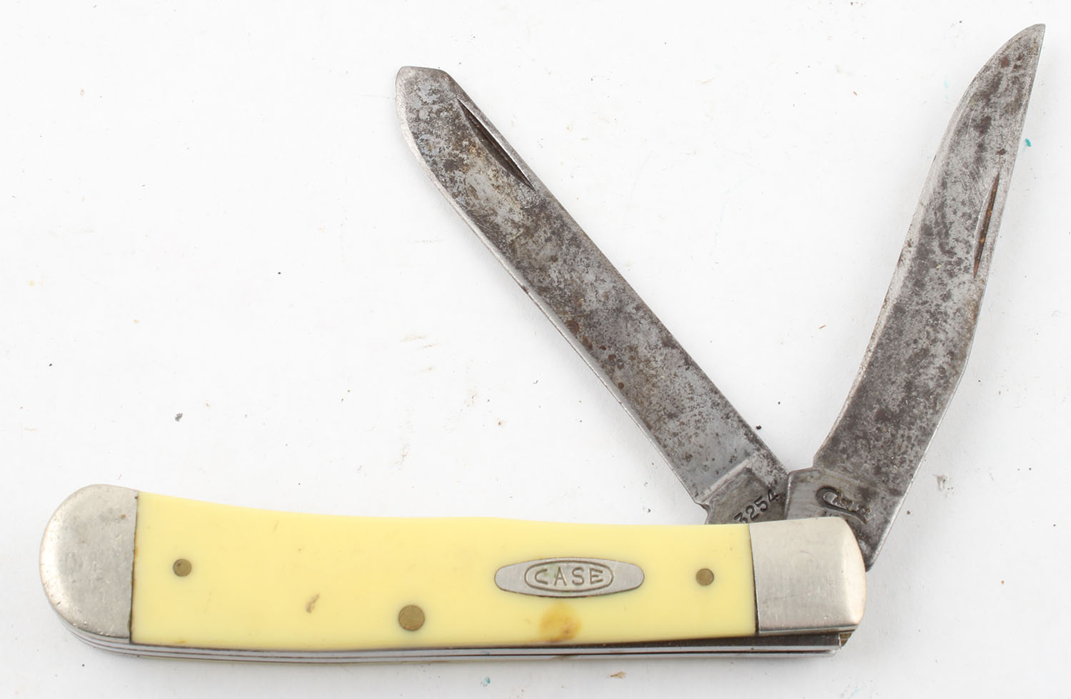 Case knife, 2 folding blades, #3254, 3'' longest blade, has age soiling. Grade: Very Good - Value: 20 to 100