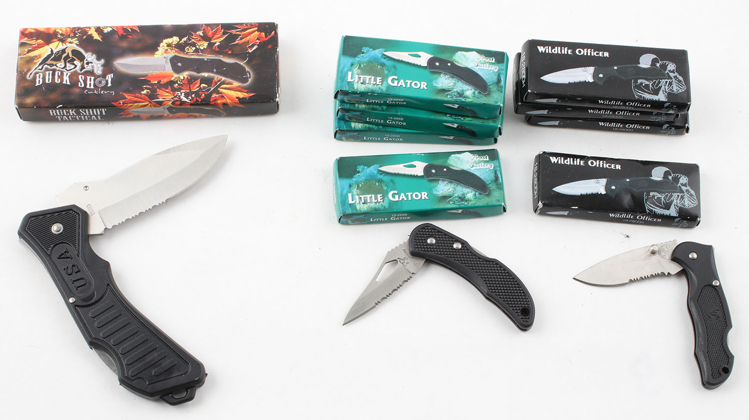 Lot of 9 folding blade knives, in original box, all solid. Grade: Excellent ++ - Value: 16 to 60