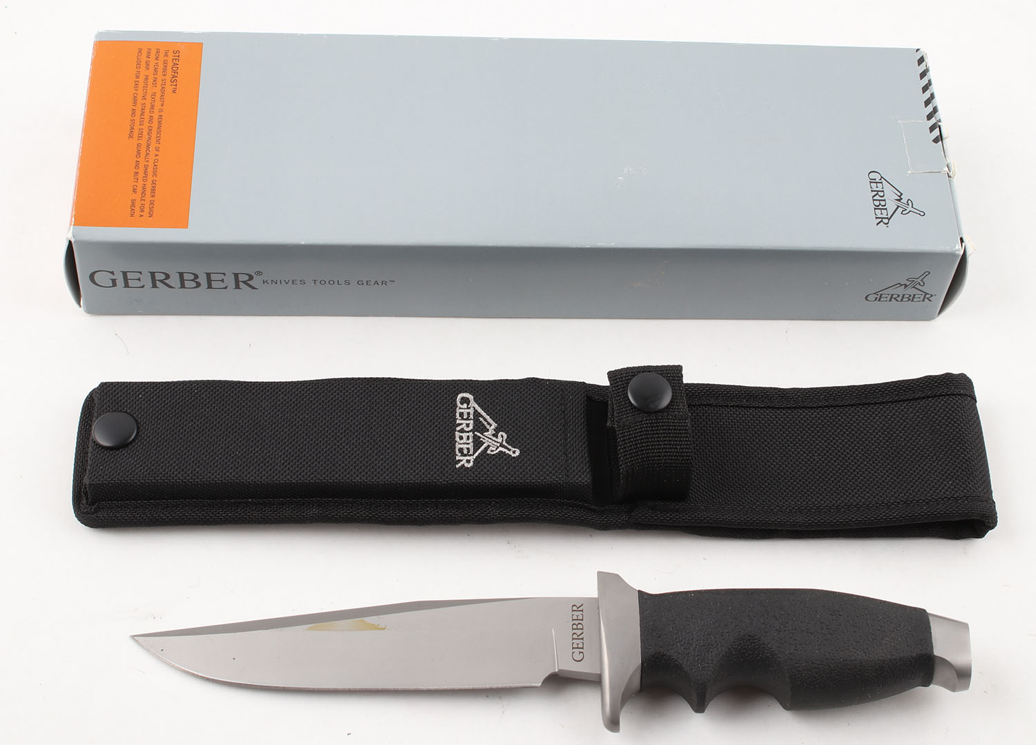 Gerber knife, Steadfast, 6'' blade, has sheath and orignal cardboard box. Grade: Excellent ++ - Value: 40 to 100