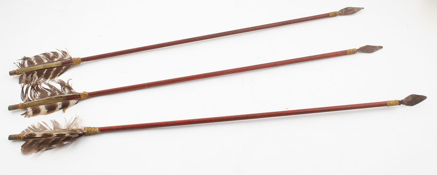 Lot of 3 Native American arrows with feathers and metal arrow heads, has age soiling, circa 1890's. Grade: Very Good - Value: 40 to 200