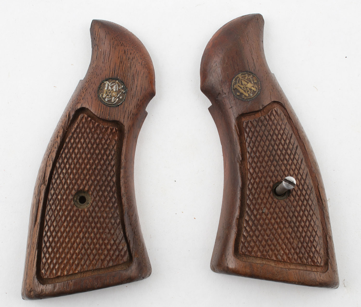 S&W wood pistol grips, K Frame, has screw, 3197 marked on inside. Grade: Excellent - Value: 30 to 90