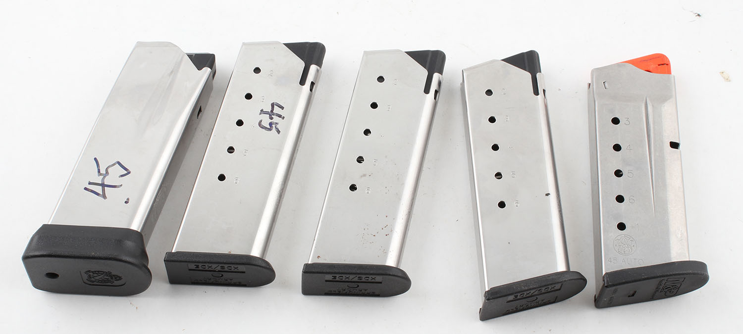 Lot of 5 .45 cal pistol mags, S&W and Springfield Armory. Grade: Excellent ++ - Value: 30 to 90