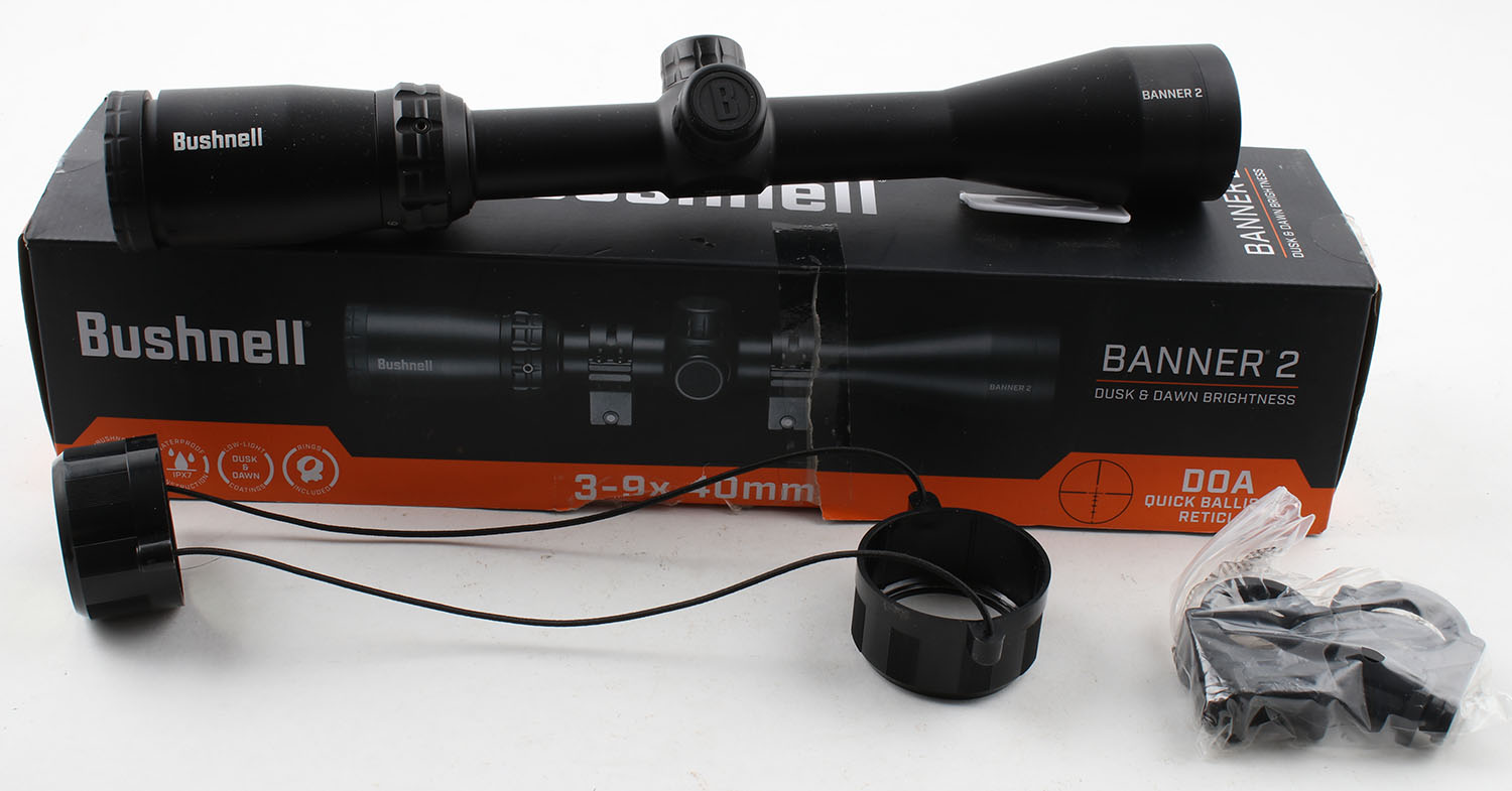 Bushnell Banner 2 3-9x40mm, Dusk & Dawn brightness, DOA, quick ballistic reticle, in original box. Grade: Excellent - Value: 50 to 100