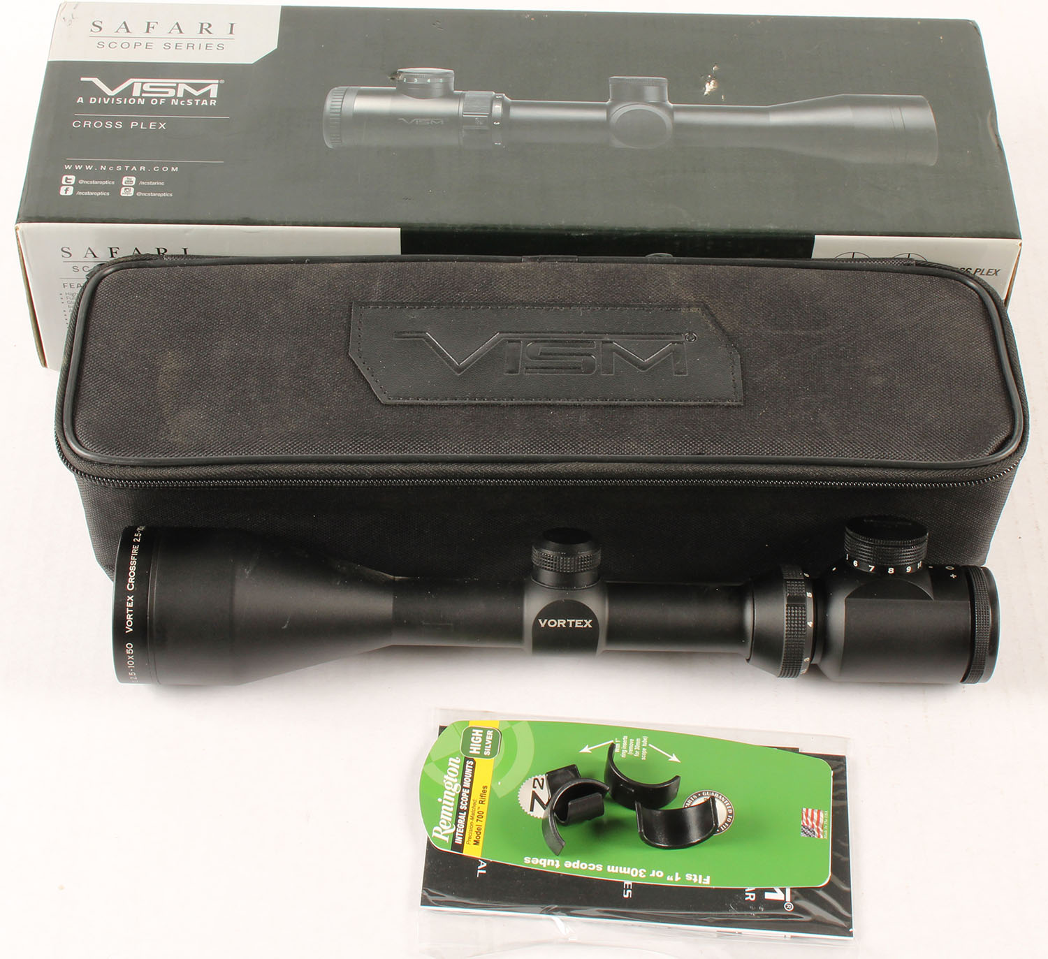 Vortex Crossfire 2.5-10x50 scope, has NcStar VSM box and carrying case. Grade: Excellent ++ - Value: 100 to 200