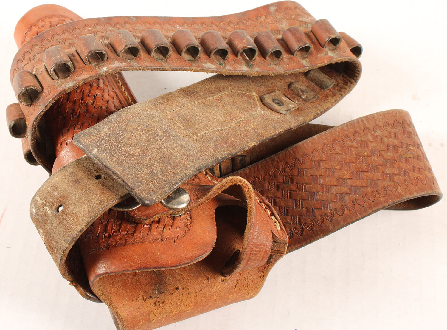 Leather ammo belt and holster, has age soiling. Grade: Very good ++ - Value: 16 to 60